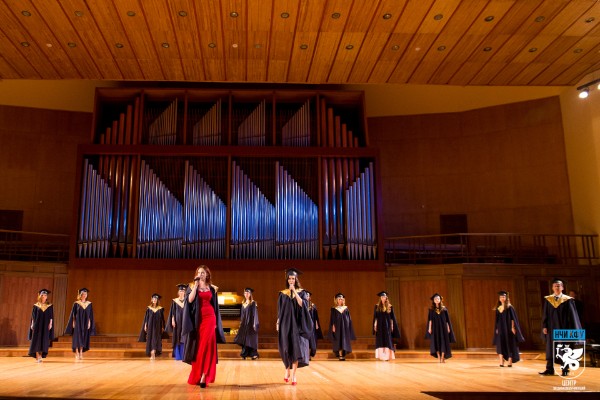 Выход 14 лучших выпускников открыл торжественный вечер. Под динамичную музыку выпускники в мантиях и конфедератках продефилировали на сцене Органного зала. Весь зал в унисон встал во время исполнения гимна всего студенчества Gaudeamus.