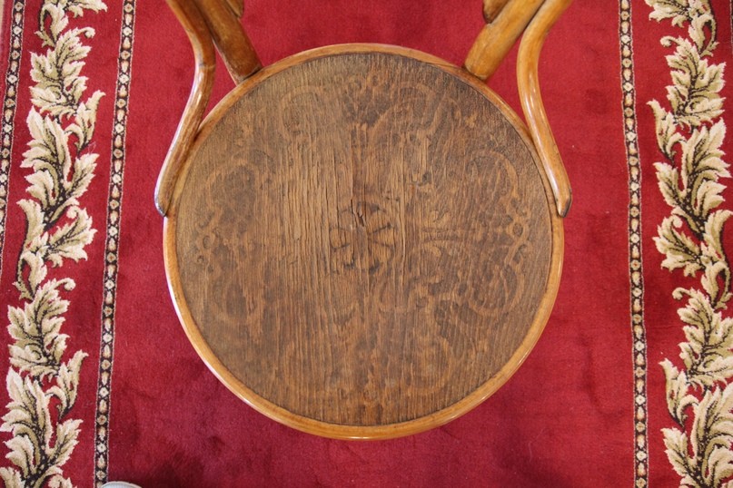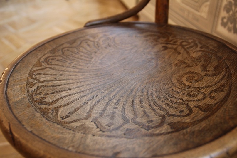 83 стула очень похожи на тот самый, что стояли в университете в 80-е гг. XIX в. Лёгкие, изящные с узором в виде раковины на сидении. Их Республиканская детская больница передала КГУ в 1980-х. Но вот что интересно. Эти стулья выполнены не фирмой «THONET», а их главным конкурентом – «Jacob&Josef Kohn».