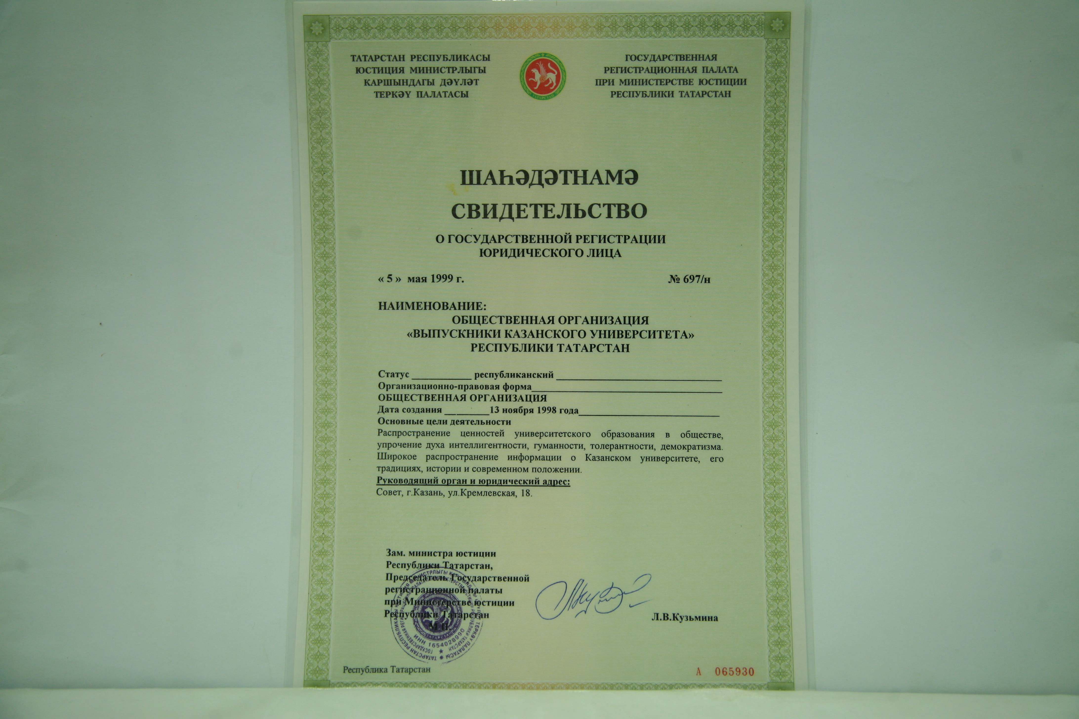 Историческая справка: 18 ноября 1998 года состоялась учредительная конференция Общественной организации "Выпускники Казанского университета" Республики Татарстан, ставшей с 2007 года - Международной Ассоциацией "Выпускники Казанского университета" (КГУ-КФУ).