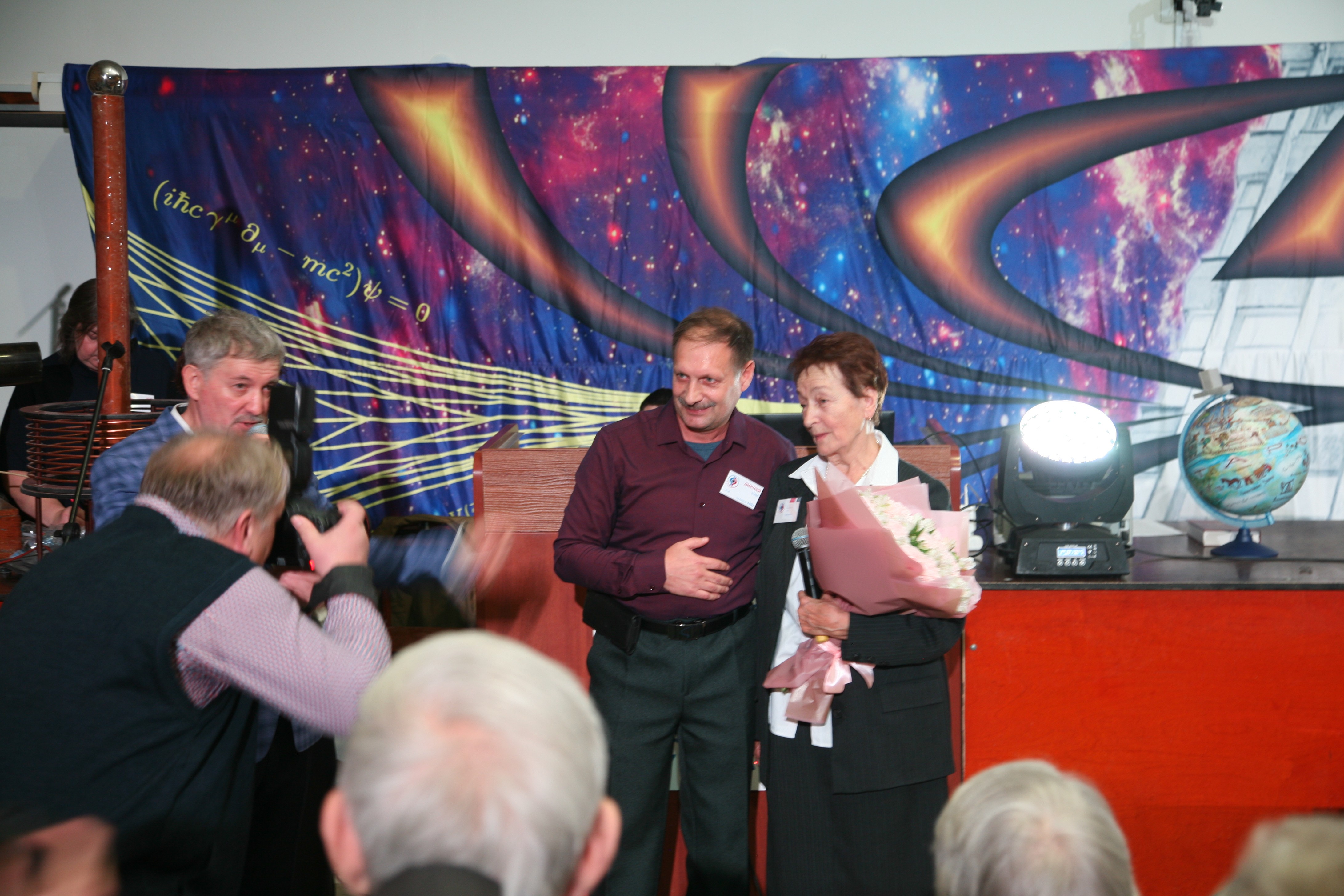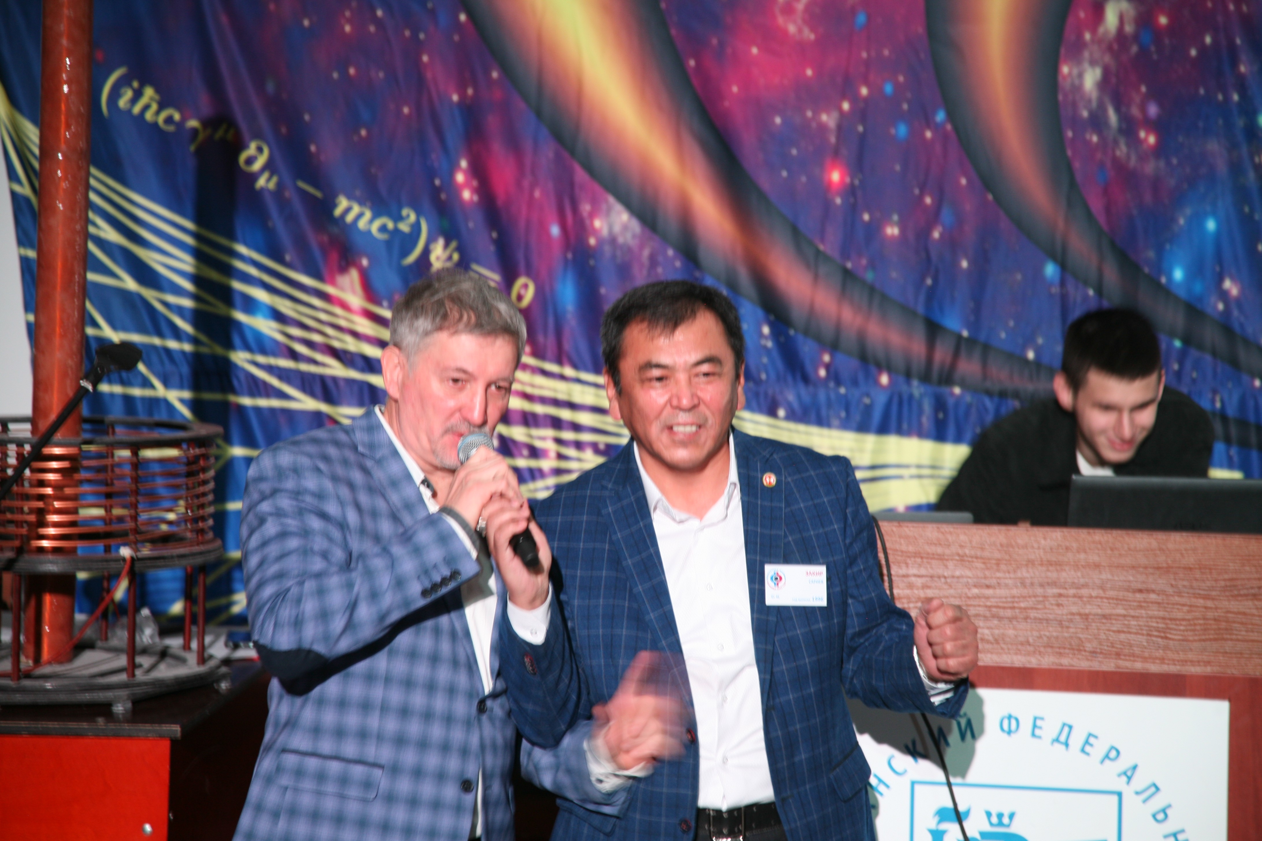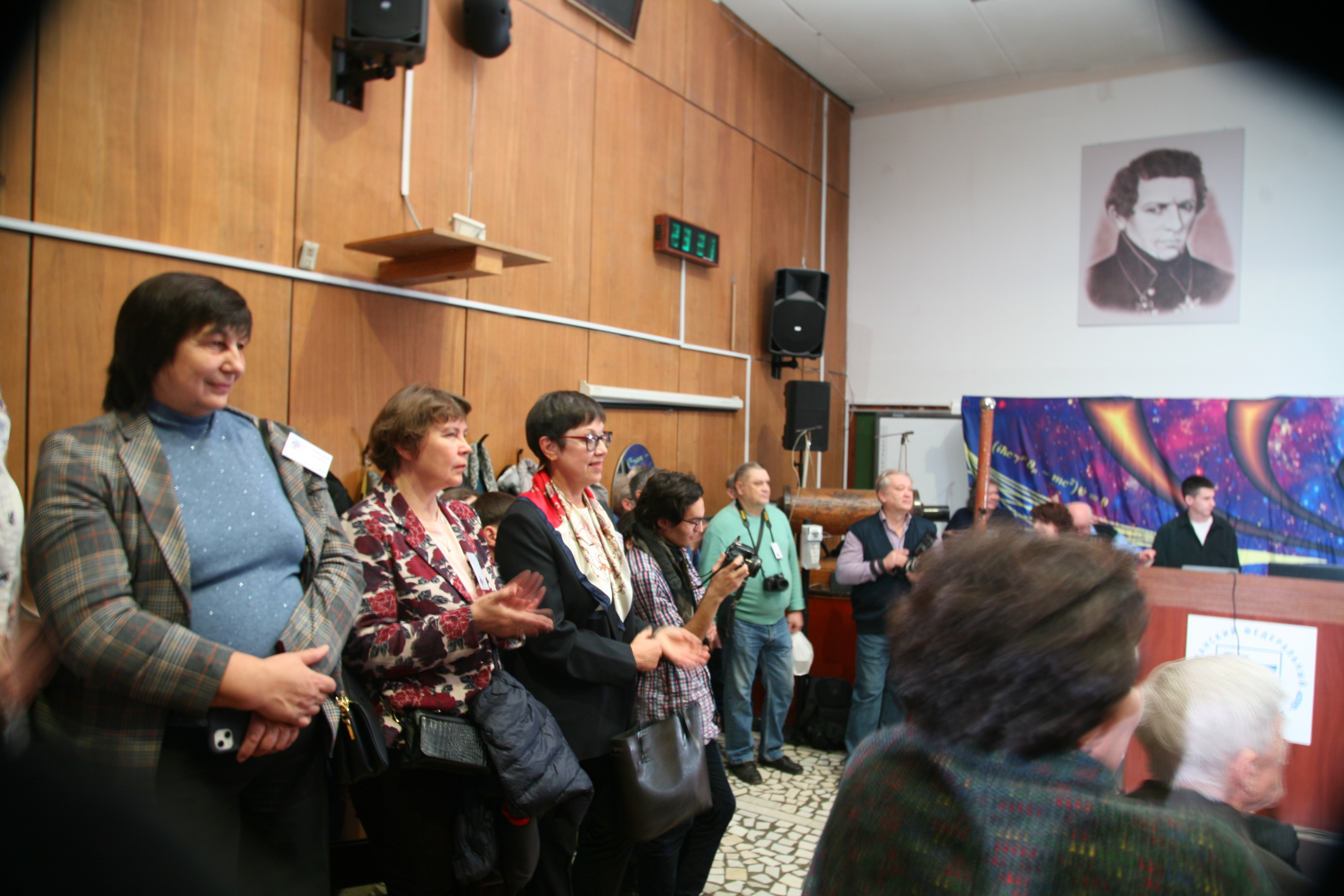 23 ноября 110 аудитория не могла вместить всех желающих, пришедших на встречу выпускников физического факультета. Организаторы предвидели подобную ситуацию и заранее побеспокоились об организации прямой трансляции на огромный экран в фойе первого этажа, где и разместились газеты, плакаты, организованные поколениями выпускников. Выпускники физфака, для встречи, привезли личную звуковую (Валерий Мустафин) и световую аппаратуру, креативно разработали и оформили сцену, подготовили различные видеоряды слайд-шоу.