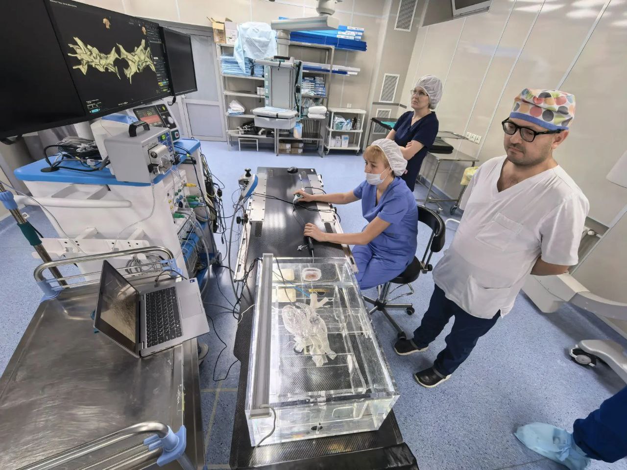 Для отработки мануальных навыков участникам был предоставлен специальный тренажер — аквариум с моделью сердца, изготовленной с помощью 3D-печати. Кроме того, специалисты получили возможность усилить практическую подготовку с реальной навигационной системой.