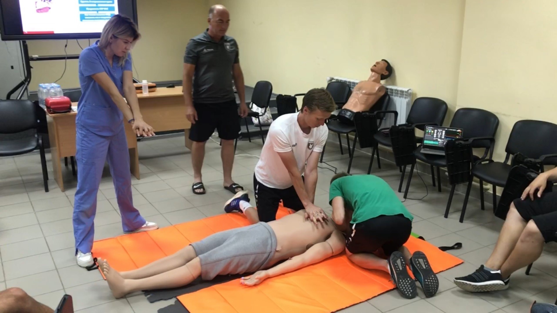 В ходе обучения сотрудники ФК «Рубин» ознакомились с теоретическими понятиями о важности обеспечения безопасности спасателя при оказании первой помощи, с причинами остановки кровообращения и отсутствия сознания, с важностью раннего начала компрессий грудной клетки дефибриляции при остановке кровообращения, освоили алгоритм и правила вызова помощи.