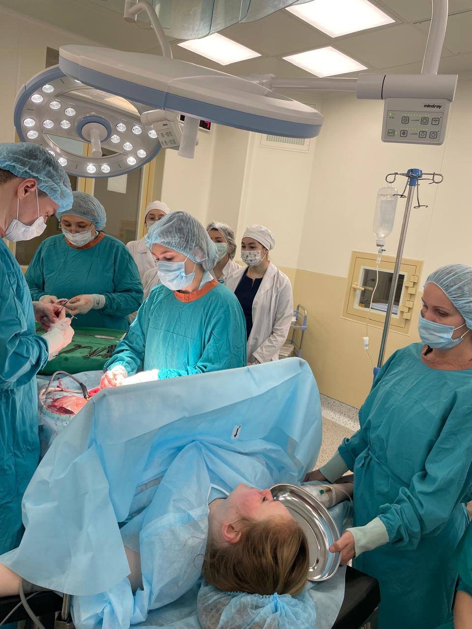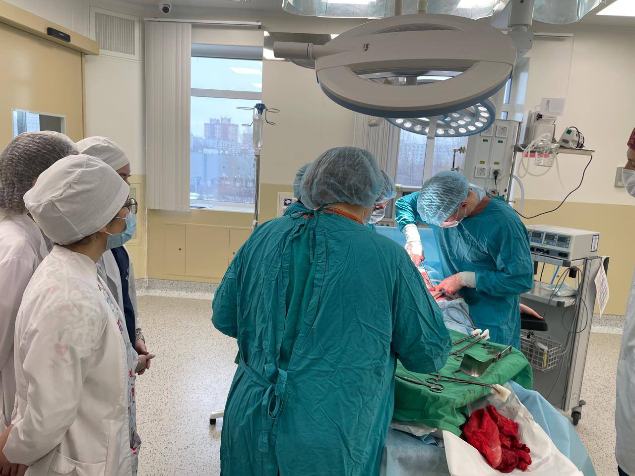 На фотографии студенты 5 курса Лечебного дела на дисциплине по выбору " Экстрагенитальная патология"наблюдают за проведением операции "Кесарево сечение" в перинатальном центре 7 ГКБ. Перподаватели Хасанов АА и Шигабутлинова ТН