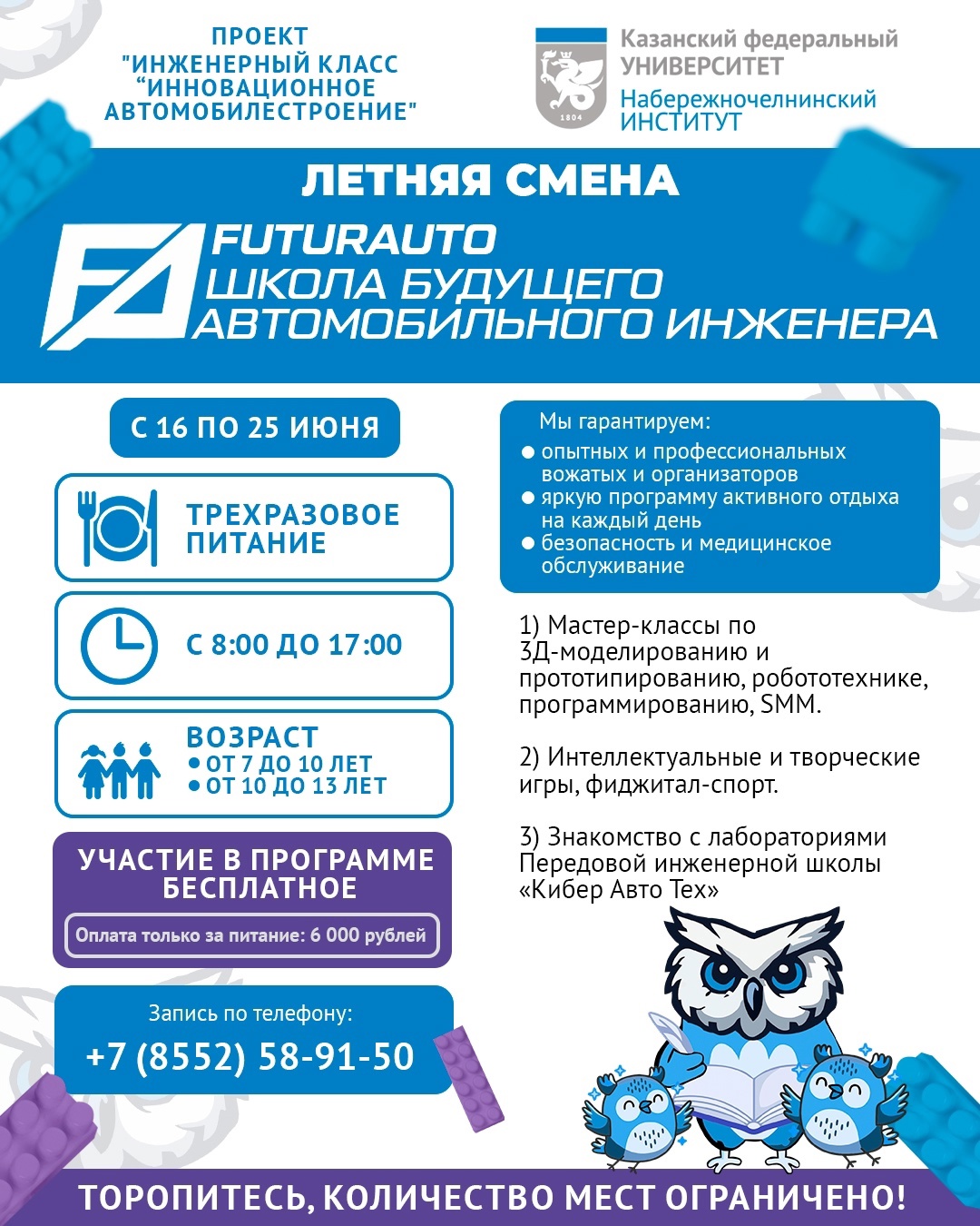 Набережночелнинский институт КФУ приглашает юных инженеров на летнюю смену FUTURAUTO! Школа будущего автомобильного инженера.
