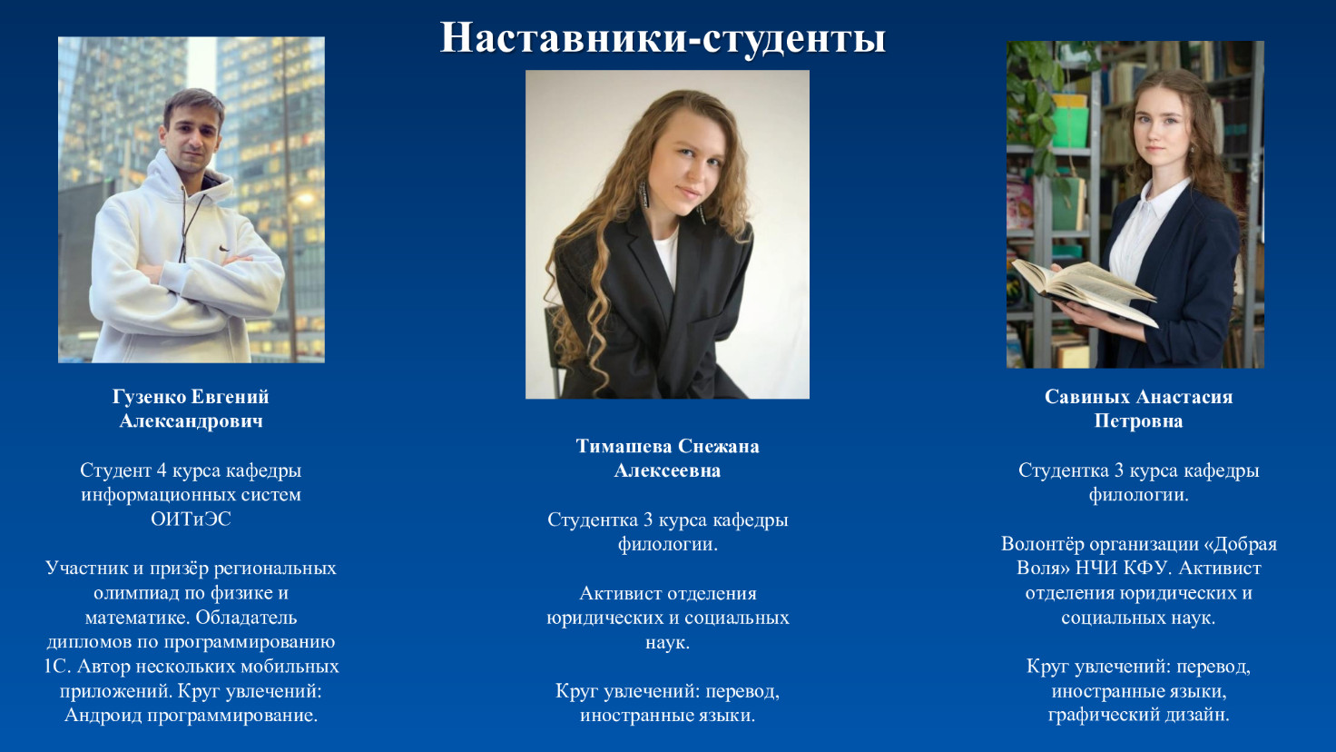 В этом году участниками программы стали студенты кафедры филологии Тимашева Снежана и Савиных Анастасия под руководством заведующей кафедры профессора Биляловой Альбины Анваровны, и студент кафедры информационных систем Гузенко Евгений под руководством заведующего кафедрой доцента Валиева Рустама Асгатовича.