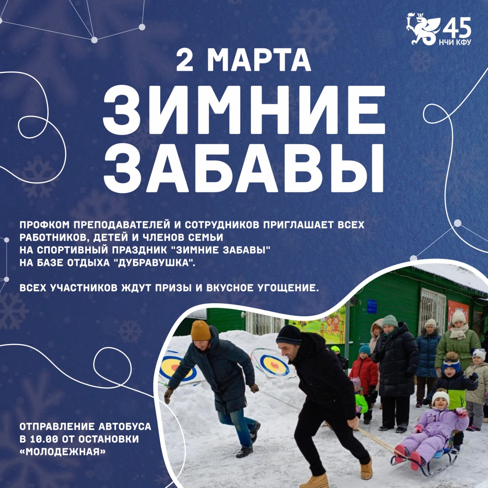 Профком преподавателей и сотрудников приглашает всех работников, детей и членов семьи на спортивный праздник «Зимние забавы» на базе отдыха «Дубравушка».