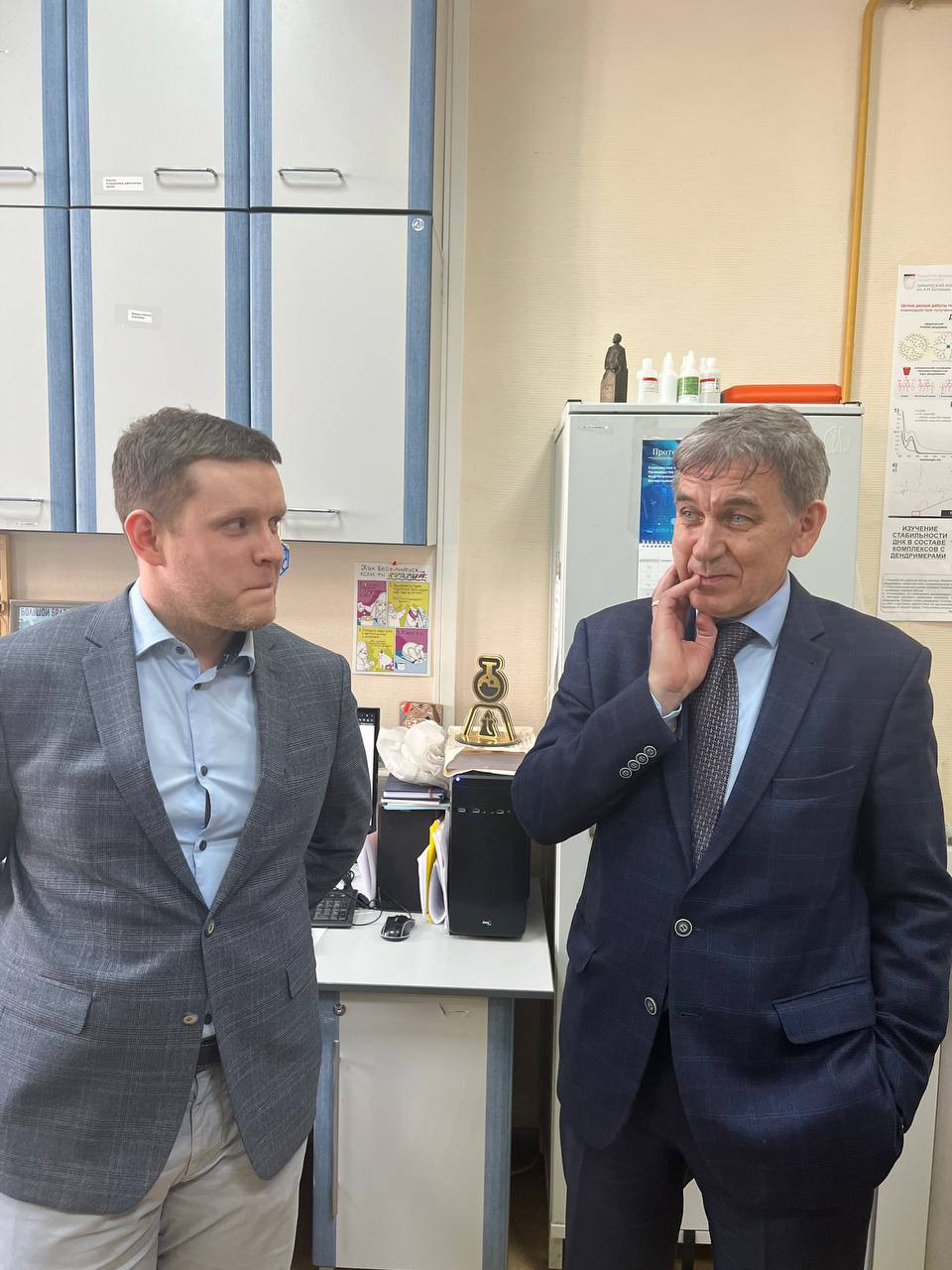 Александр Витальевич ознакомился с работой нескольких лабораторий, коллективы которых проводят исследования, поддержанные грантами Фонда. В ходе беседы с сотрудниками обсуждались вопросы об организации работы Фонда, о критериях отбора проектов, а также ключевые показатели, установленные Фондом.
