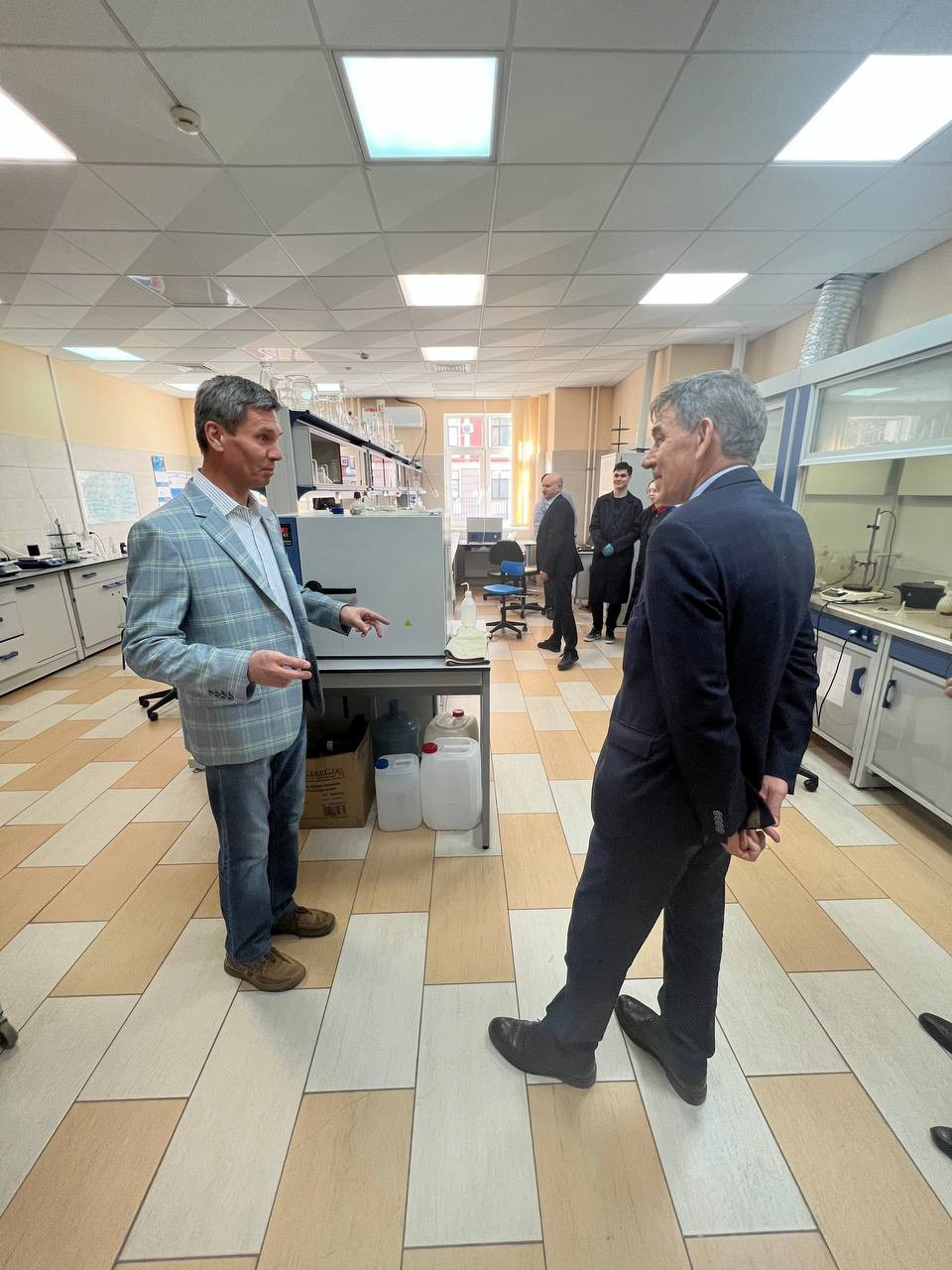 В ходе экскурсии директор Химического института Зиганшин М.А. рассказал об особенностях подготовки молодых специалистов в научных группах, о работе с одаренными школьниками и студентами, а также об уникальном научном оборудовании, имеющемся в институте.