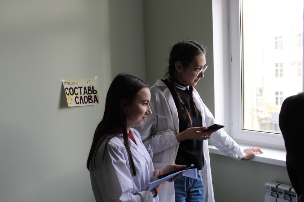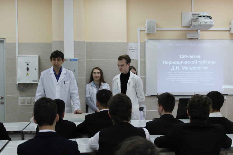 В начале мероприятия ребята познакомились с интересными фактами из жизни великого химика Д. И. Менделеева и создания Периодической таблицы (докладчики С. Фазылова, И. Агзамова). Далее четыре команды учащихся в сопровождении кураторов-студентов (А. Кузекенова, К. Мухаметшина, В. Николаев, К. Лебедева) отправились на станции: «Решение ребусов» (отв. Н. Шитвенкина), «Химический бой» (отв. В. Носков, С. Фазылова), «Игра слов» (отв. Т. Николаев, И. Агзамова), «Отгадай послание» (отв. Фадеева А.), где им предстояло выполнить задания за определенное время, при этом участники получали отрывок Периодической таблицы. Если восьмиклассники справлялись с заданиями раньше отведенного времени, им предоставлялась возможность заработать дополнительные баллы, ответив на вопросы своих кураторов-студентов. После прохождения обучающимися всех испытаний первокурсницы А. Салихова и А. Хусаинова продемонстрировали опыты «Дым без огня», «Несгораемый платок», «Огненная метель», «Зима в стакане», которые также не оставили участников квеста равнодушными. Затем ведущий мероприятия В. Носков объявил победителей и призеров, которые получили сладкие призы и фото на память (фотограф Е. Слинченко).