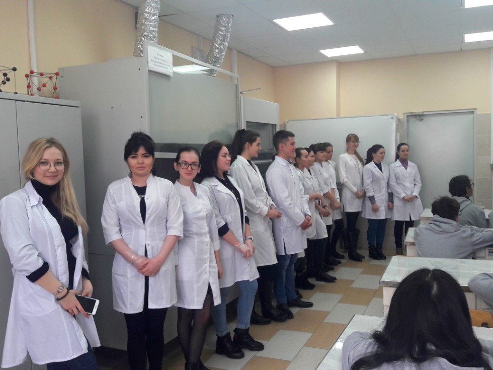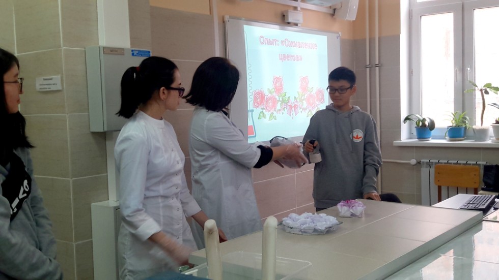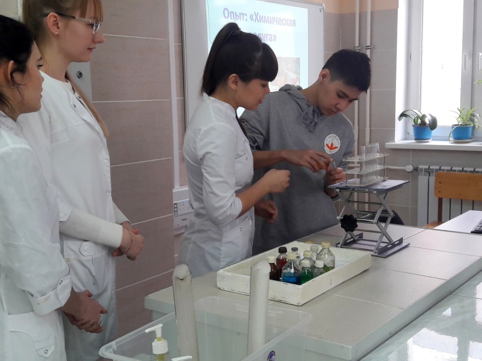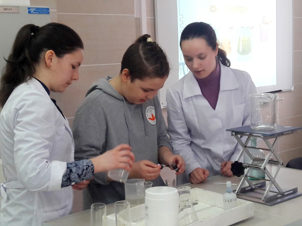 Семиклассников весной встречали студенты 3 курса 07-611 группы педагогического бакалавриата (профиль химия) под руководством зав.кафедрой химического образования С.И. Гильманшиной. Школьникам очень понравились химические опыты, в выполнении некоторых они приняли непосредственное участие. Это «Химический светофор» и «Волшебная пена» (демонстрировали студенты Влада Огонькова и Разиля Шарифуллина), «Оживление цветов» и «Заживление раны» (демонстраторы – Луиза Гиздатова, Миляуша Гатауллина, Виктория Яковлева), «Химический вулкан» (проделали опыт студенты Аделина Сабирова и Юлия Степанова), «Волшебная бутылка» и «Химическая горелка» (демонстрировали Камилла Ким и Регина Муллахметова), «Химическая радуга» и «Бенгальские огни» (демонстраторы – Полина Миронова, Гузель Абдуллина и Раиля Сагдуллина)», «Гейзер» (показали опыт Ангелина Ващенко и Ренат Шигабутдинов).