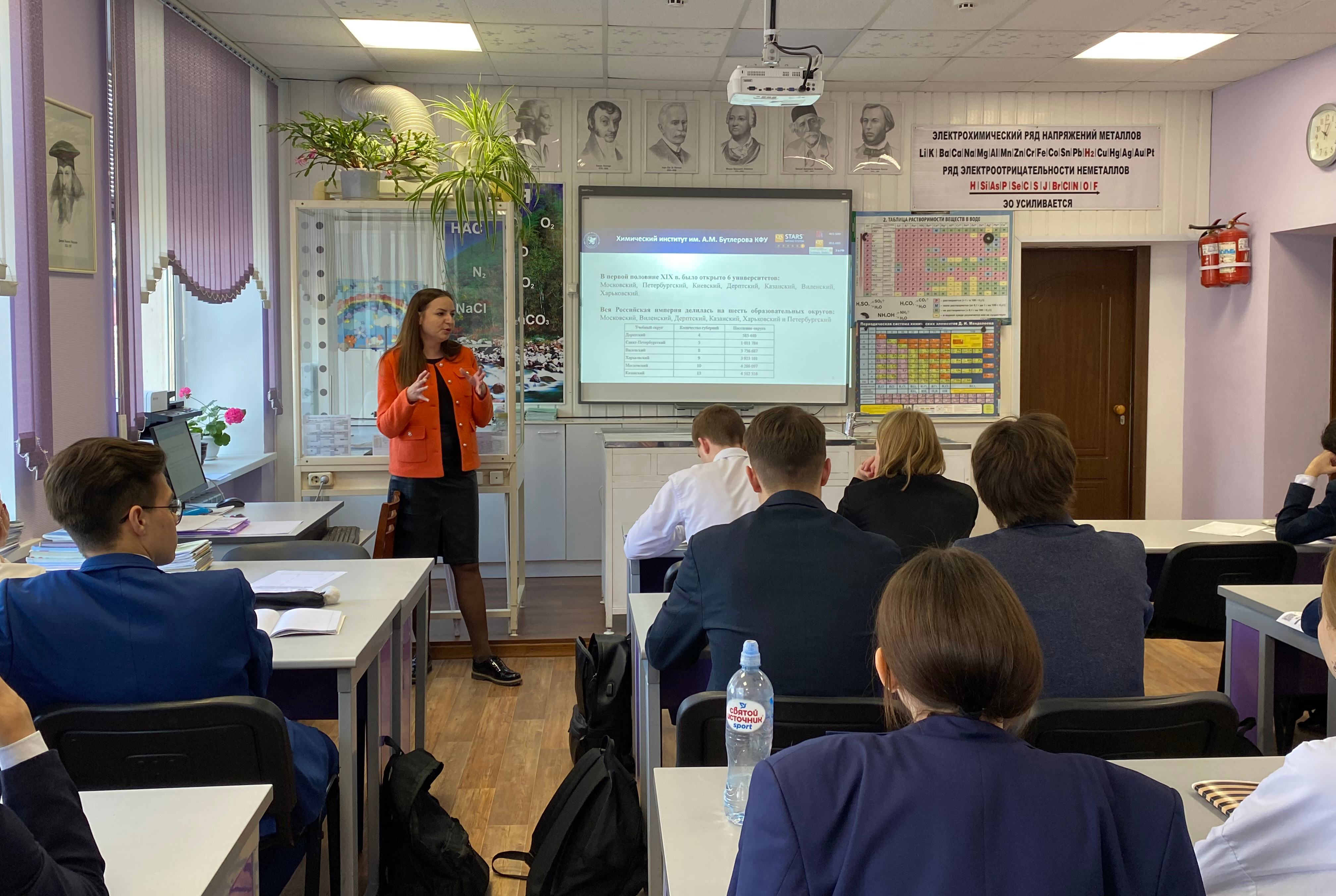 14 апреля в рамках проекта «Ученые – в школе» кандидат педагогических наук, доцент кафедры Химического образования Химического института им. А.М. Бутлерова КФУ Мельникова Гульнар Фаритовна провела встречу с учащимися 11 класса МБОУ Гимназия №122 имени Ж.А. Зайцевой Московского района г. Казани с лекцией о развитии химической науки в Казанском университете. Первую химическую лабораторию Казанского университета называют «колыбелью органической химии», и это немудрено: в этих стенах начинали свою работу самые известные ученые-химики – Николай Зинин, Карл Клаус, Александр Бутлеров, Владимир Марковников, Александр Зайцев, Александр и Борис Арбузовы и т.д., и именно об их роли в развитии химического образования, науки и промышленности было рассказано школьникам.