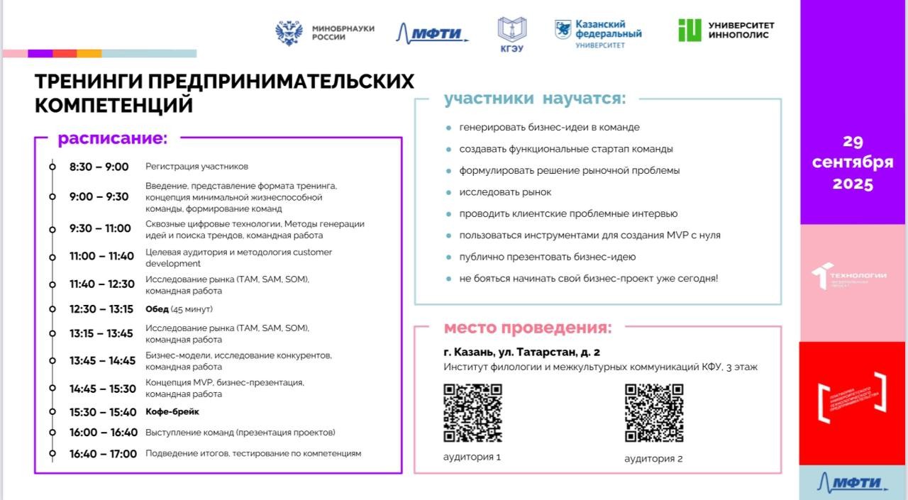 Тренинги — это «Трендвотчинг игра для предпринимателей», которую для студентов проведут специалисты из Университета «Иннополис». За два предыдущих года в Тренингах предпринимательских компетенций приняло участие более 1100 студентов КФУ.