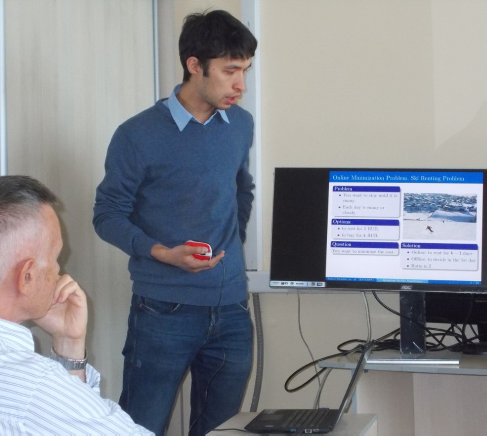 На семинаре с докладом "Квантовые онлайн алгоритмы с ограниченной памятью" выступил Камиль Равилевич Хадиев. Он рассказал о задачах, на которых удается показать, что квантовые онлайн алгоритмы имеют преимущество перед классическими даже в случае, если классические алгоритмы получают подсказку.