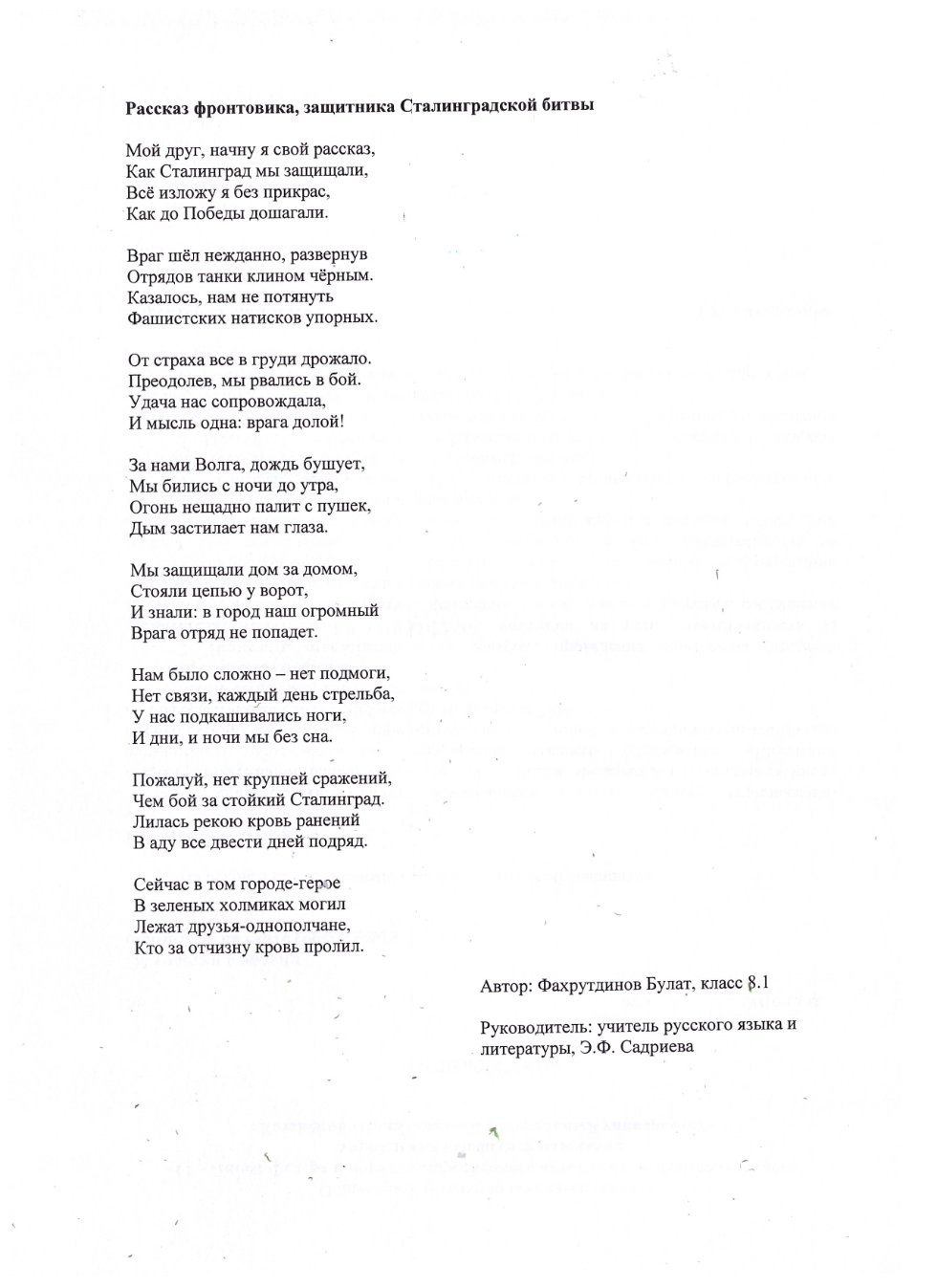 Рассказ фронтовика устами их потомков (работа Фахрутдинова Булата, класс 8.1)
