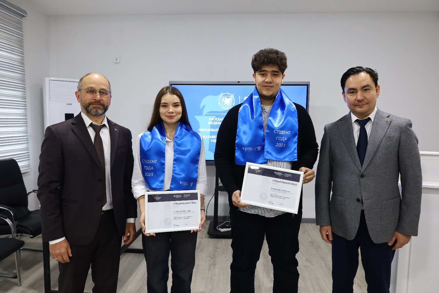 Проректор по внешним связям КФУ Алишев Тимирхан Булатович поздравил лучших студентов филиала, вручив награды победителям ежегодного конкурса «Студент года» — Ксении Галкиной и Достону Хамракулову. Эти студенты отличились высоким уровнем успеваемости, активным участием в научной и общественной жизни, а также проектной деятельности. Новому исполнительному директору филиала Эльдару Хасанову был вручен фирменный знак университетского сообщества — знак доверия и ответственности.