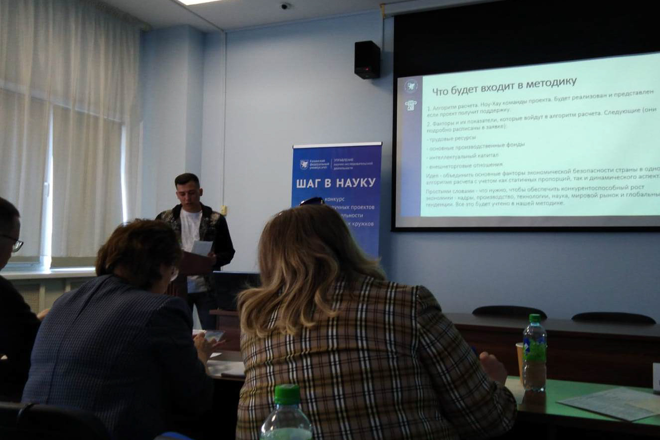 В Казанском федеральном университете прошел второй тур студенческого научного конкурса «Шаг в науку» (https://kpfu.ru/science/nauchno-issledovatelskaya-rabota-studentov-nirs/konkursy/konkurs-39shag-v-nauku39). Отделение экономических и юридических наук, кафедру экономики и менеджмента и кружок «Экономист-исследователь» представлены студенческим научным проектом на тему «Разработка методики оценки экономической безопасности территории».