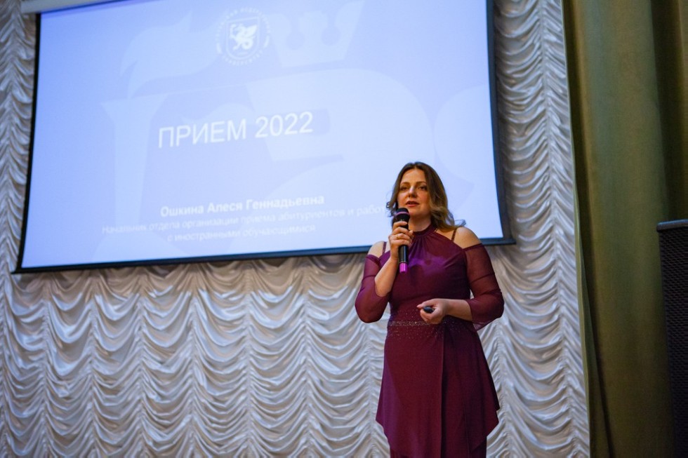 «Сегодня мы завершаем масштабный этап профориентационной работы, потому что приближаются новые задачи, а вместе с ними и необходимость технической подготовки самой приемной кампании», - начала свое выступление Алеся Геннадьевна. Она познакомила выпускников с календарем приемной кампании Казанского федерального университета, а также отметила изменения в приемной кампании нынешнего года: в 2022 году будет только одна волна зачисления в ряды студентов КФУ, а для того, чтобы оказаться в списках обучающихся теперь недостаточно дистанционного согласия - зачисление будет проводиться только на основании оригинала аттестата или диплома об образовании. Спикер так же отметила, что с 2022 года вступает в силу важное нововведение: абитуриенты могут получить дополнительные баллы к ЕГЭ при наличии не только золотого знака отличия ГТО, но и за серебряный, и за бронзовый знак.