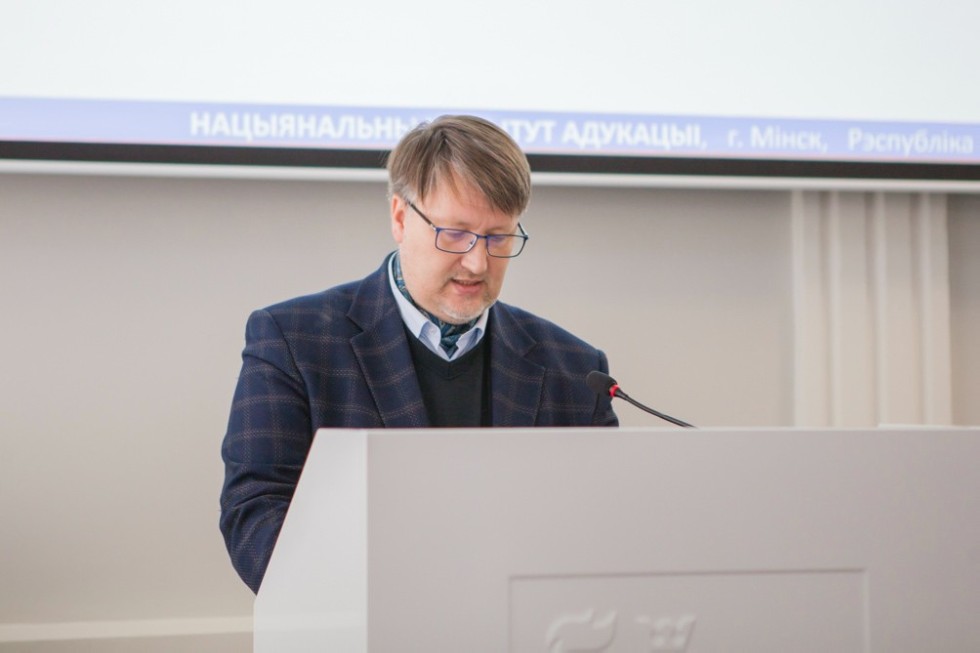 Пленарное заседание продолжилось прочтением докладов. Первым выступил начальник управления мониторинга качества образования, старший научный сотрудник лаборатории гуманитарного образования научно-методического учреждения «Национальный институт образования» Министерства образования Республики Беларусь (г. Минск) Вячеслав Короткевич с работой «Формирование и развитие эмоционального и духовного интеллекта учащихся средствами литературной педагогики». Свое выступление спикер начал с разграничения понятий эмоциональный интеллект и духовный интеллект, отмечая, что литература способна повлиять и на первое, и на второе, формируя умение сопереживать, перенимать модели поведения и созерцать культурам разных стран, погружая читателей на страницы произведений. Вячеслав Иванович также очерчивал этапы эмоционального воздействия на обучающихся и приводил примеры с их реализацией. В завершение научный сотрудник обратил внимание присутствующих на то, что в работе по формированию эмоционального и духовного интеллекта важна системность и комплексность действий.