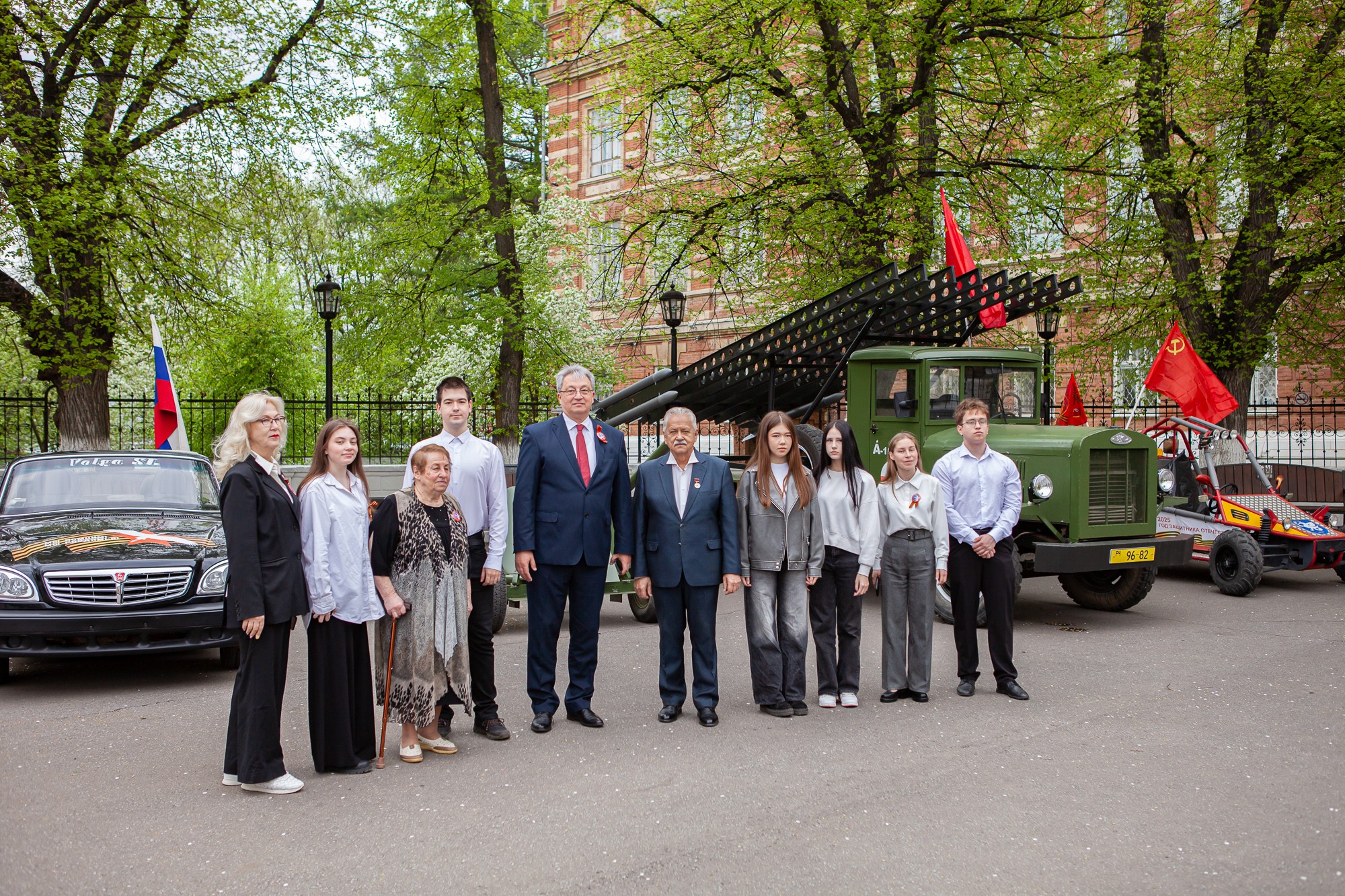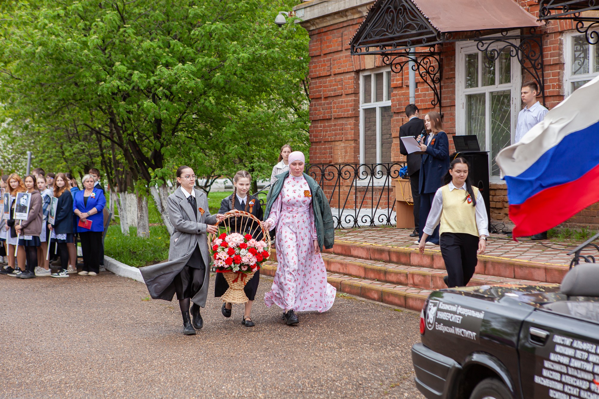 Утром на университетской площади главных гостей торжества – ветеранов вуза – встречали директор Елабужского института КФУ Марат Умаров, преподаватели и волонтеры. Здесь же была представлена выставка военной техники, созданной студенческим конструкторским бюро «Эврика». В этом году к украшенным флагами танку, «Волге», дрифткару присоединилась боевая машина реактивной артиллерии – легендарная «Катюша».