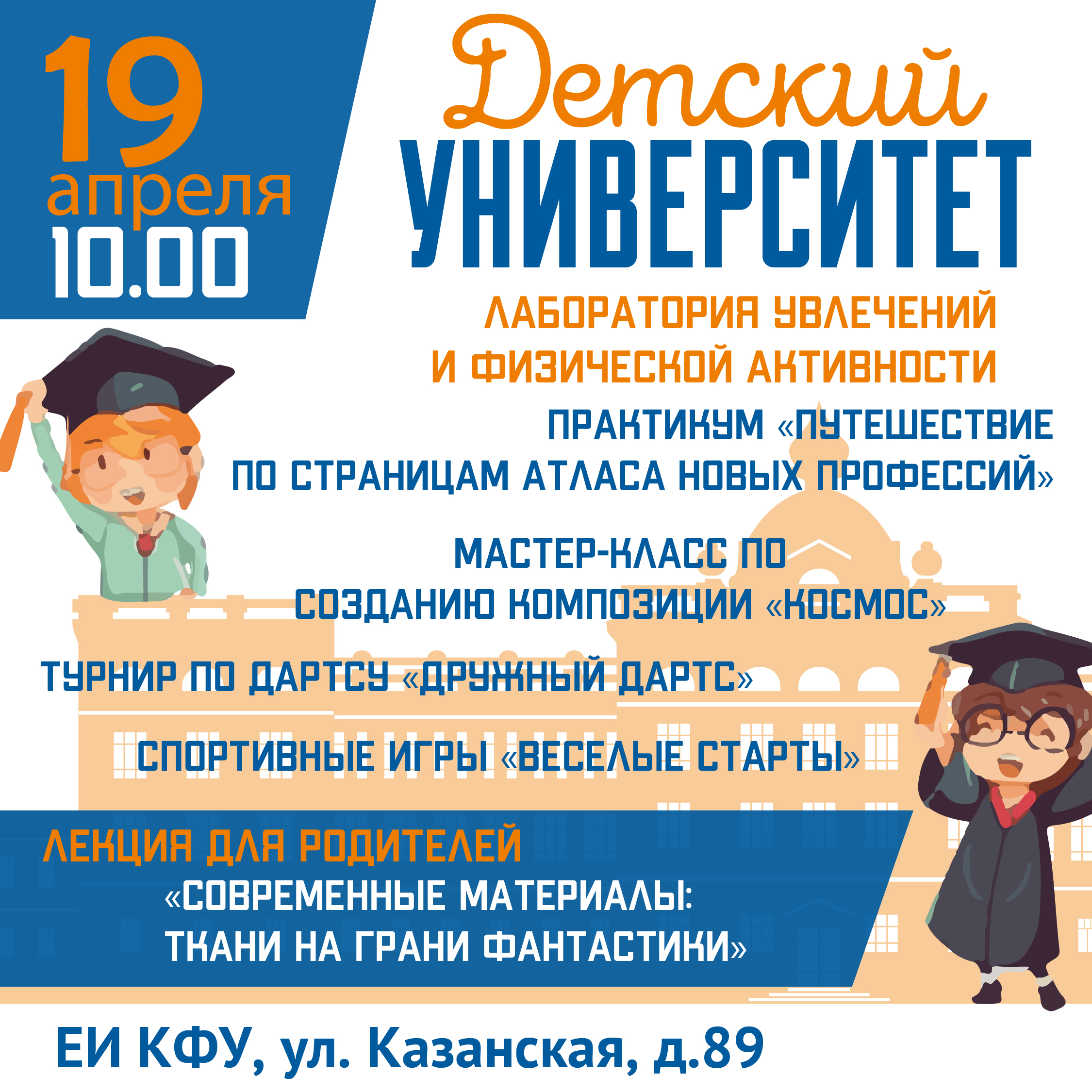 19 апреля 2026 года Елабужский институт Казанского федерального университета приглашает вас на очередное занятие Детского университета. Вас ждет насыщенная и разнообразная программа «Лаборатория увлечений и физической активности».