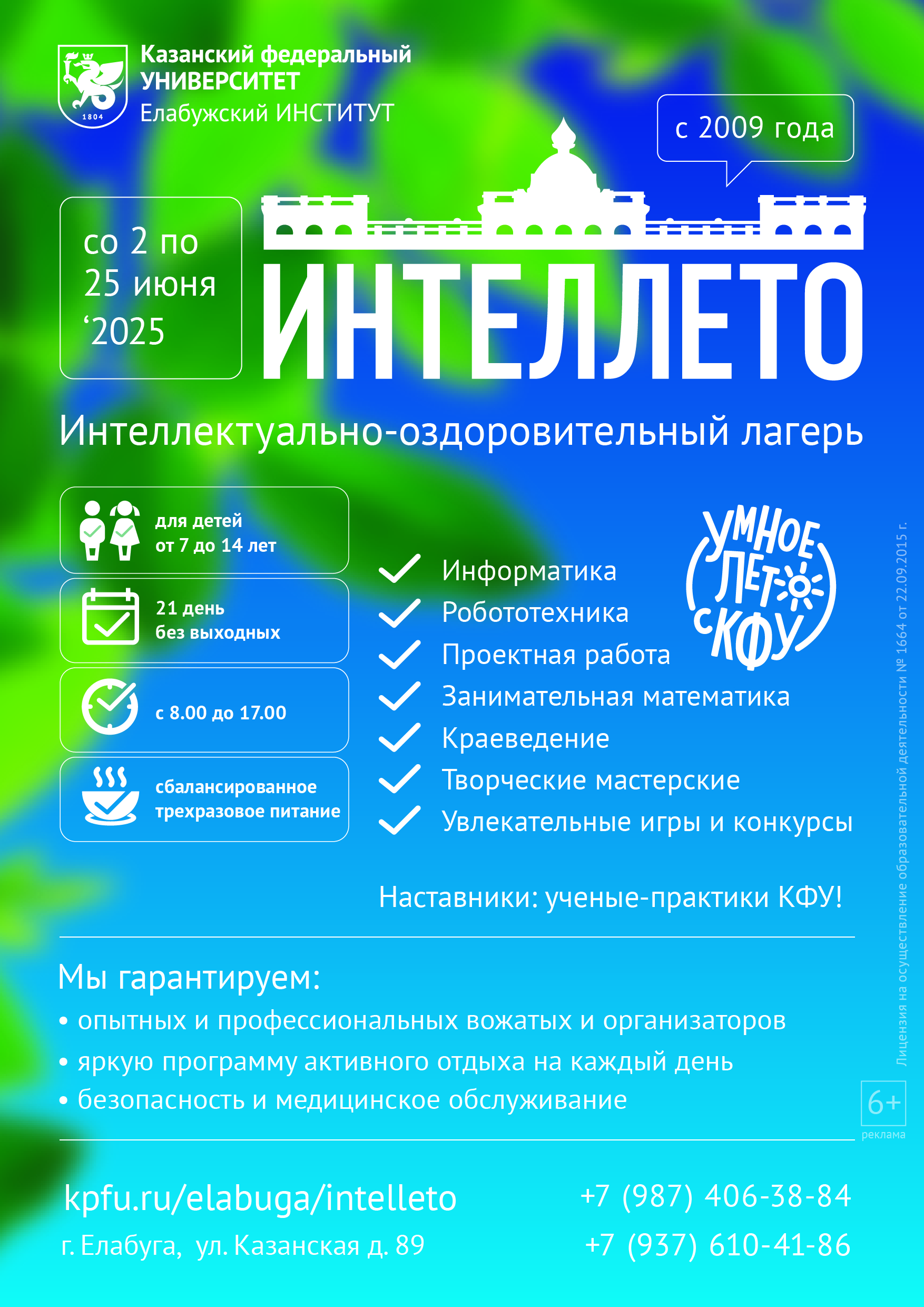 Елабужский институт КФУ приглашает детей от 7 до 14 лет в интеллектуально-оздоровительный лагерь «ИнтелЛето»! Лагерь базируется в главном здании ЕИ КФУ, занятия проводятся в учебных аудиториях, а вожатыми станут лучшие студенты института, прошедшие специальную подготовку.