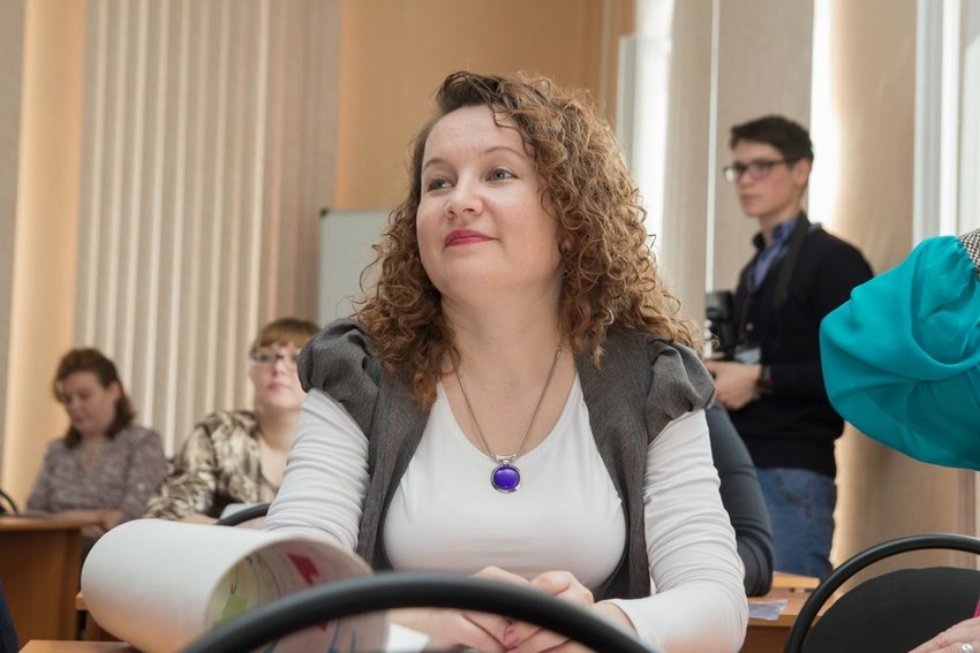 О проблемном обучении в условиях ФГОС рассказала старший преподаватель кафедры русской и зарубежной литературы Верёвкина И.Н. Тема мастер-класса – «Технология проблемного диалога как средство реализации ФГОС на уроке литературы». Ирина Верёвкина опиралась на работу известного учёного Е.Л. Мельниковой, которая занималась разработкой технологии проблемноно диалога более двадцати лет. Цель данной методики состоит в том, чтобы главным действующим лицом на уроке сделать ученика. Учащиеся в активном диалоге с учителем должны заниматься постановкой проблем и поиском их решений. Ирина Верёвкина показала применение технологии проблемного диалога на практике. Преподаватель сумела построить проблемный урок, тема которого в ходе беседы была сформулирована участниками мастер-класса: «Проблема взаимоотношений «отцов» и «детей» в рассказе Ф. Искандера «Авторитет». Разделившись на группы, молодые учителя и студенты пытались разрешить поставленную проблему с позиций отца, сына-подростка и автора. В конце урока преподаватель предложила участникам создать собственный кодекс «моральных норм личности», который поможет молодому поколению не сбиться с правильного пути. Так были выполнены четыре главных пункта технологии проблемного диалога: постановка проблемы, поиск решения, выход и реализация продукта деятельности.