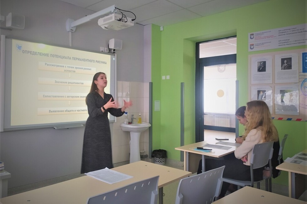 Особый отклик у аудитории вызвал доклад студентки 4-го курса Анастасии Морозовой «Перманентный рисунок на теле как поликодовый текст» (тема НИ «Перманентный рисунок на теле как разновидность поликодового текста: прагматический и лингвокогнитивный аспект»). Работа с аудиторией была построена на основе интерактивного метода обучения: старшеклассники попробовали себя в роли исследователей, стараясь считать информацию, заложенную в вербально-невербальных знаках, и сделать совместные выводы о потенциале перманентного рисунка как средстве трансляции информации.