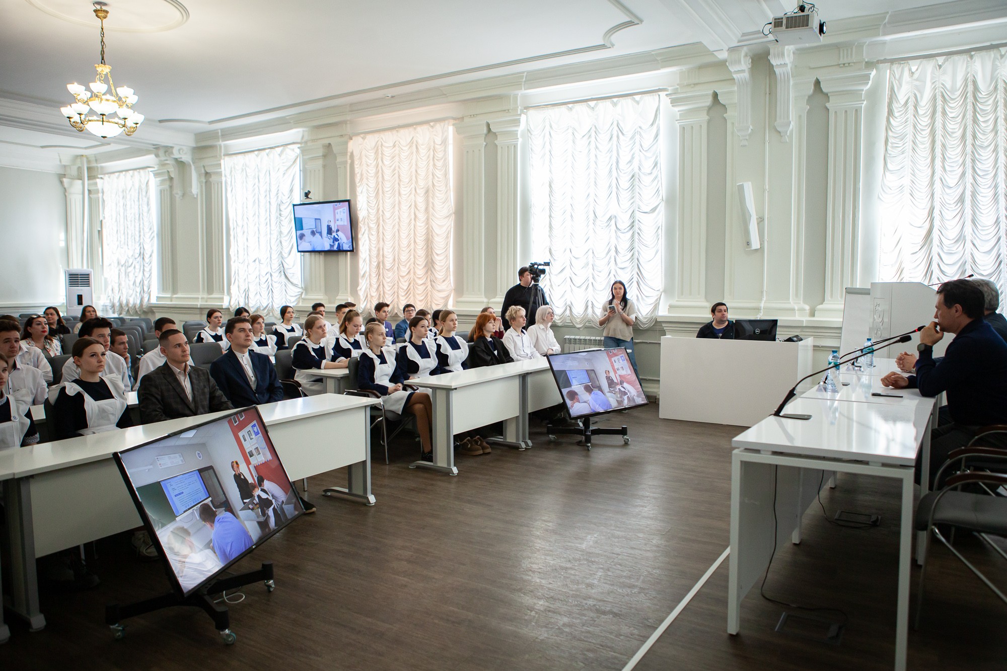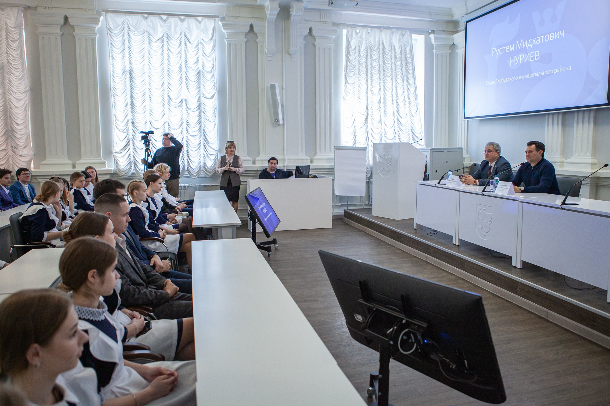 В конференц-зале Елабужского института КФУ ученики «Университетской» школы из города Лисичанска Луганской Народной Республики встретились главой Елабужского района Рустемом Нуриевым. Напомним, 50 одиннадцатиклассников завершают учебу в мирной обстановке, чтобы успешно поступить в российские ссузы или вузы.
