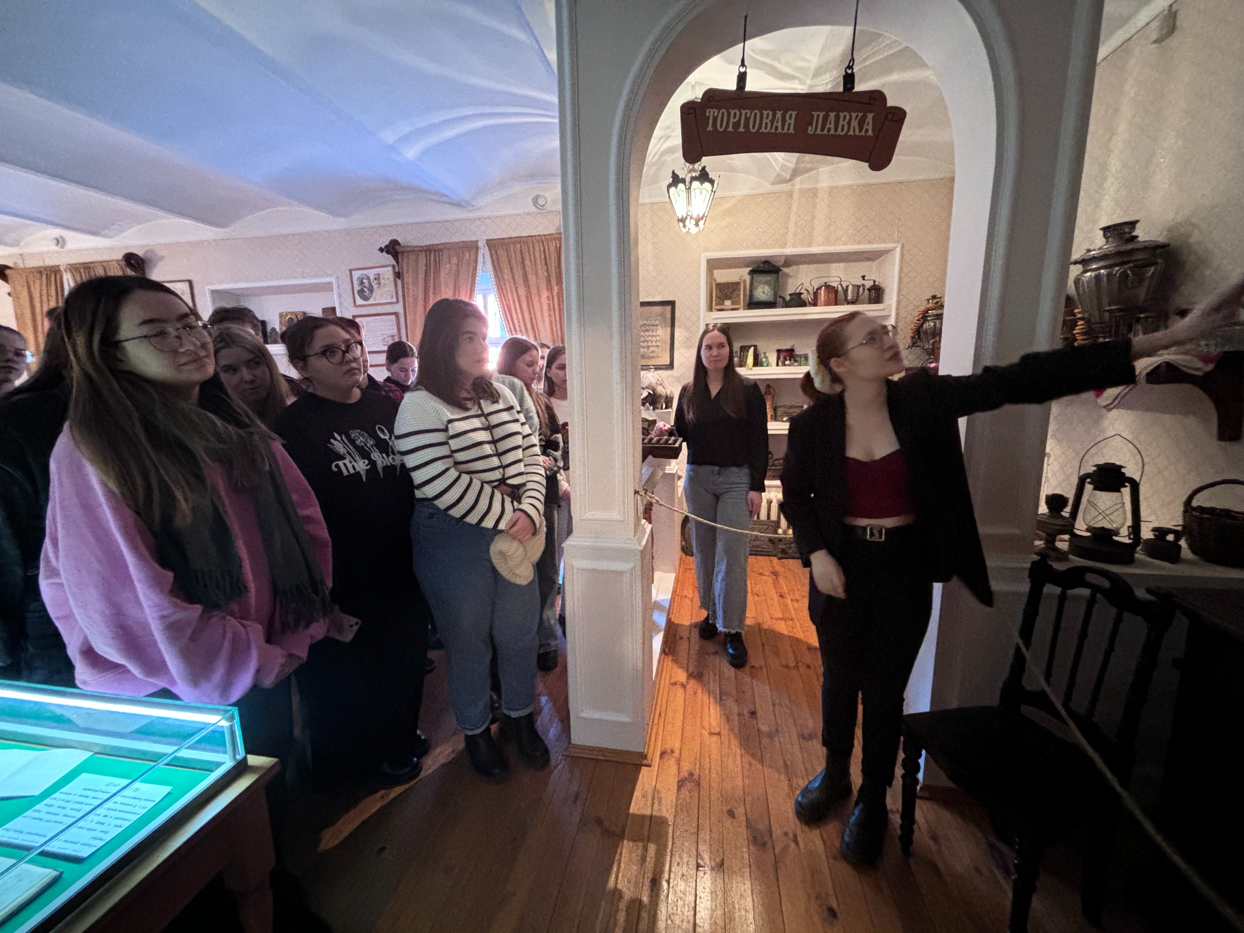 Студентам рассказали об организации торговли в то время. Лавки, где купцы продавали свои товары, часто располагались на первых этажах жилых домов. Кроме того, студенты узнали о традициях, которые существовали в семьях купцов. Самыми нарядными комнатами были столовая и гостиная, где купцы проводили время за музыкой, чтением литературных произведений и играми.