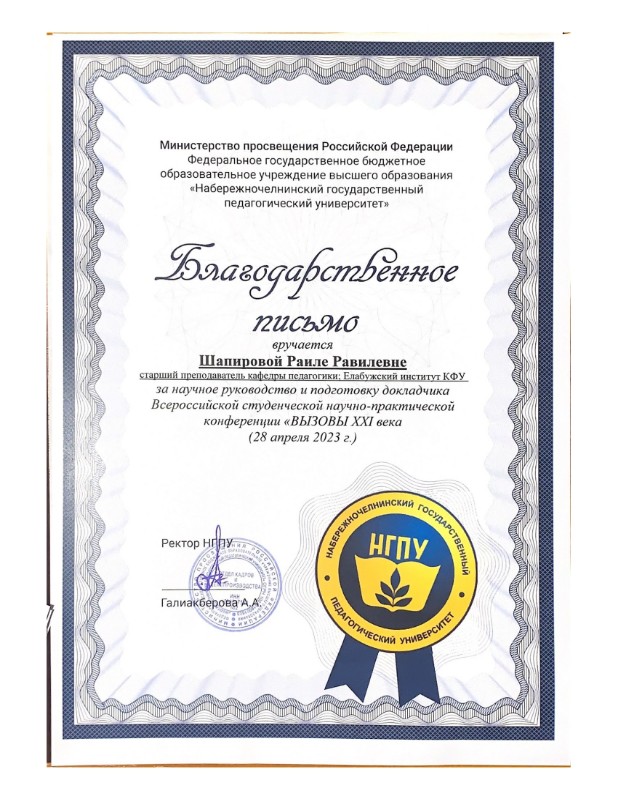 Научным руководителем является старший преподаватель кафедры педагогики Шапирова Раиля Равилевна.