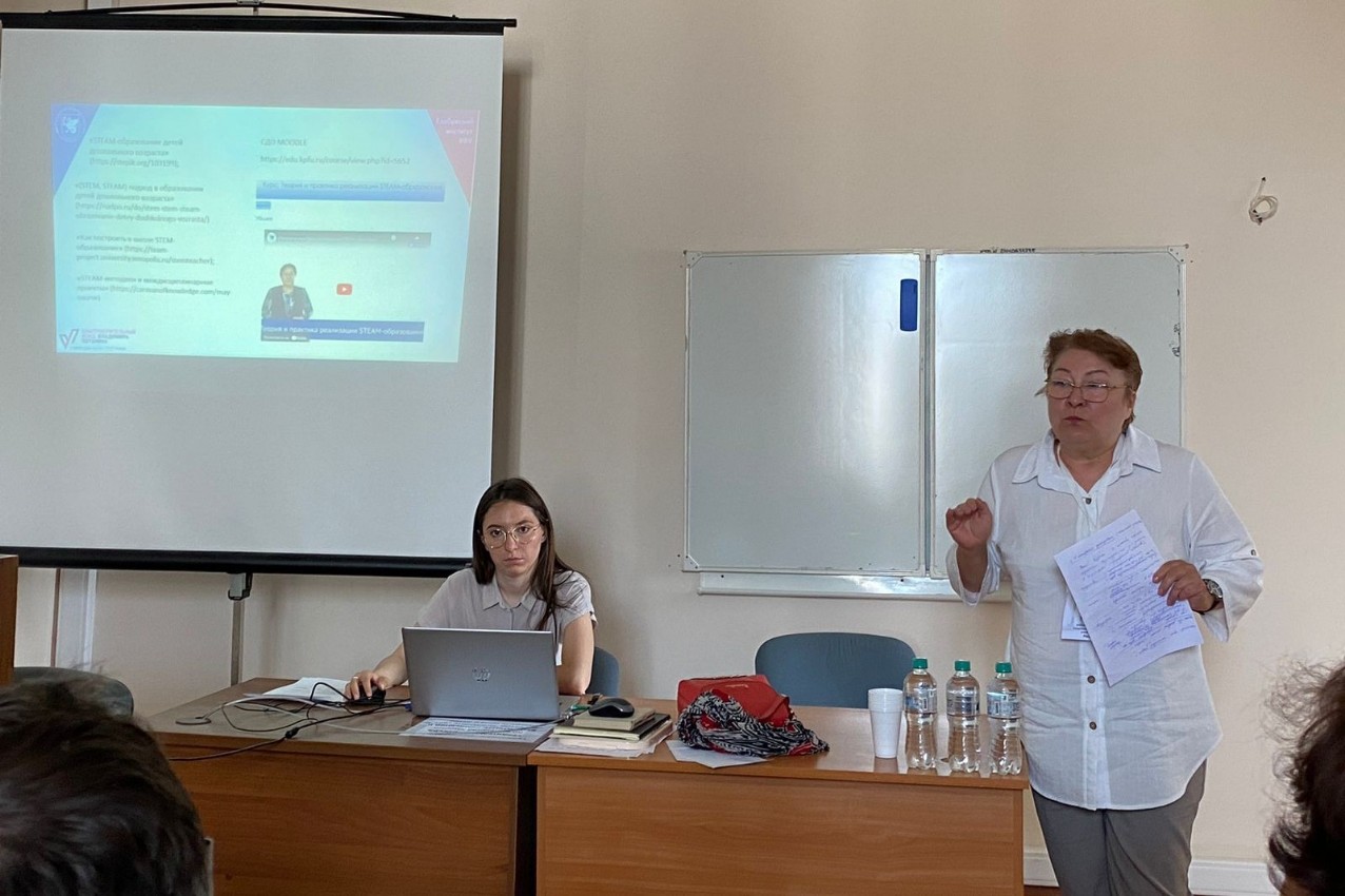Доцент кафедры физики Сабирова Ф.М. предоставила вниманию участников секции один из этапов работы по реализации проекта победителя грантового конкурса для преподавателей магистратуры Стипендиальной программы Владимира Потанина и выступила с докладом, подготовленным совместно с доцентом кафедры математики и прикладной информатики Анисимовой Т.И. «Цифровой образовательный ресурс «Теория и практика реализации STEAM-образования» в системе подготовке будущих педагогов», в котором поделилась опытом не только разработки и использования данного ресурса в Елабужском институте КФУ, но и в целом о модуле «Технологии STEAM-образования», посредством которого в 2022 году была актуализирована магистерская программа «Цифровое образование». Участников секции также заинтересовало это выступление, поскольку, как оказалось, многие были не знакомы с такой современной технологией, как STEM- и STEAM-подходы в образовании.