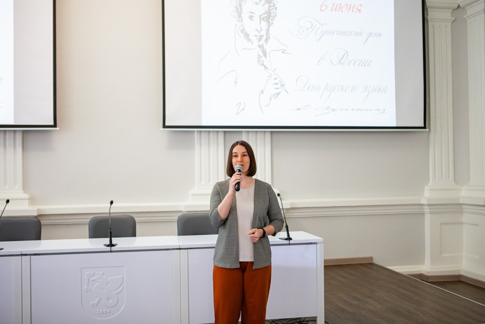 Торжественная часть мероприятия была открыта приветственным словом начальника учебного отдела Лилии Мударисовны Сёминой, в котором она поздравила от себя и от лица руководства нашего вуза всех неравнодушных к русскому слову, русской поэзии, к творческому наследию А.С. Пушкина с праздником. Также отметила достаточно широкую географию участников: на конкурс были поданы 45 заявок из Туркменистана, Узбекистана, Киргизии, Китайской Народной республики.