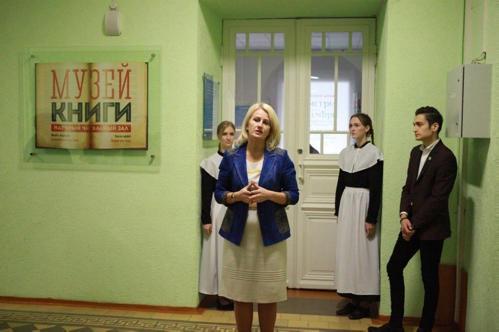Мероприятие открыла директор Елабужского института Казанского федерального университета Елена Мерзон: «Сегодня знаменательный день: в нашем институте открывается очередной просветительский проект. Очень важно, если он станет центром притяжения для учащихся школ, для общественности, потому что книга - это главный источник знаний, который сопровождает нас всю жизнь. Идея проекта зародилась в начале года, когда мы обсуждали знаменательные даты – 120-летие со дня основания нашего учебного заведения и 190-летие со дня рождения великого русского писателя Льва Толстого. Очень приятно то, что когда мы заговорили о проекте, у него появилось много друзей, подвижников, единомышленников. Проект получил название«Музей книги», при этом важно понимать, что его основное назначение – научный читальный зал».