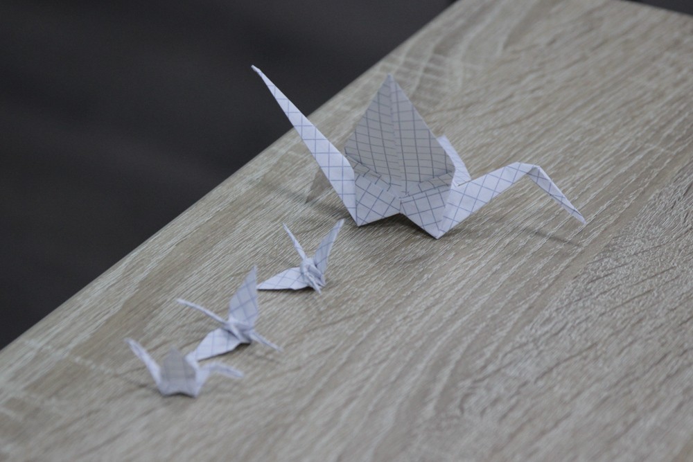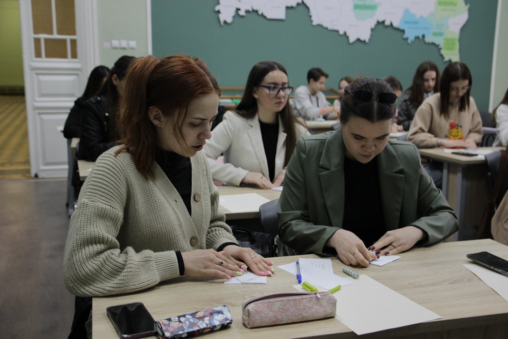 Студенты пишут письма, стихи на сделанных собственными руками журавликах в рамках акции «Письмо солдату» и мастер-класса «Журавлик памяти»