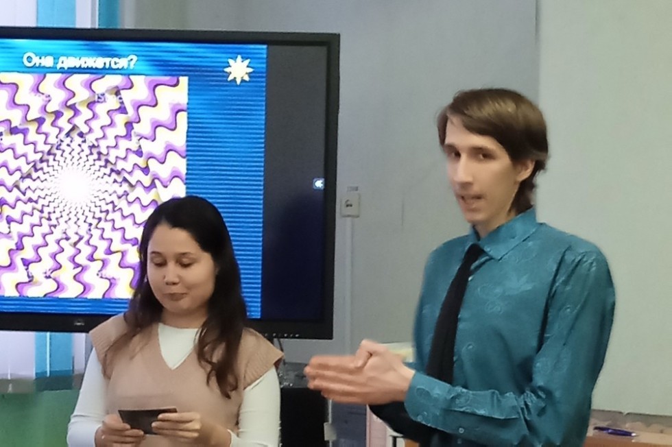 Команда, состоящая из будущих педагогов, организовала и провела с учащимися 8 классов научное шоу "Не верь глазам своим", посвященное несовершенству восприятия человеческим глазом окружающей информации и появлению разнообразных оптических иллюзий. Работа учащихся была организована в следующих направлениях: М. Очкин раскрыл "секреты" ложного восприятия некоторой зрительной информации, И.Нургудина предложила школьникам порешать задания-кейсы, а М.Мусаева провела с ребятами опыты и показала, чем можно удивить родителей дома. В заключении шоу, руководитель научного кружка Н.Н. Масленникова провела краткую профориентационную работу и пригласила учащихся принимать участие в научных мероприятиях, проводимых Елабужским институтом КФУ.