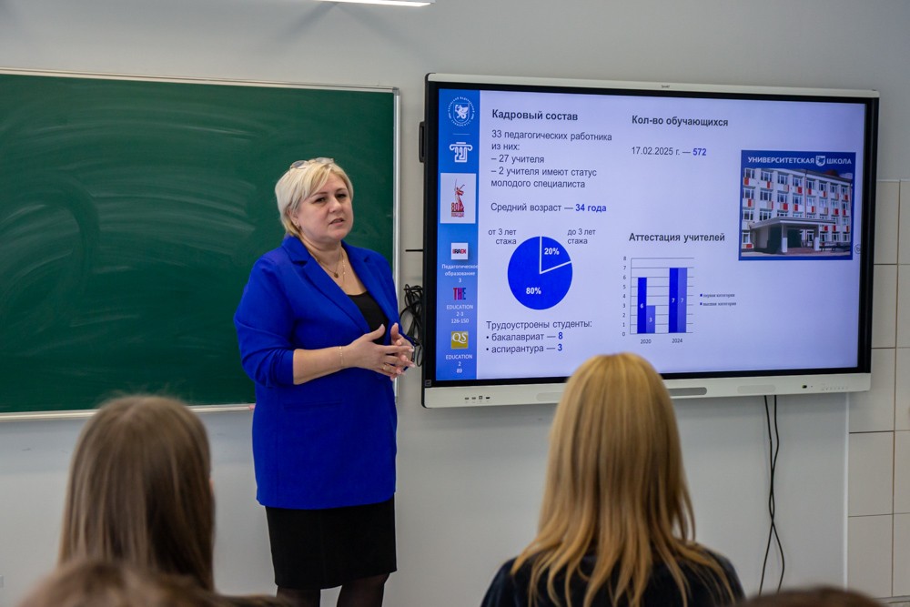Особое внимание было уделено уникальной системе взаимодействия школы и института, где наряду с учителями наставниками выступают и преподаватели вуза. Такой подход способствует дифференцированному обучению, когда старшеклассники распределяются по группам в зависимости от уровня подготовки, что помогает достигать высоких результатов.