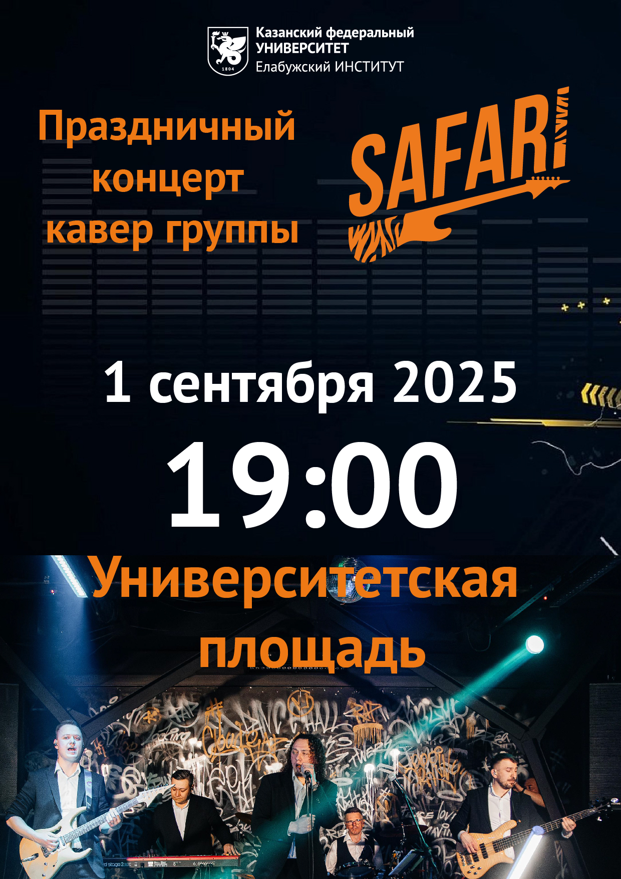 Завершится праздник большим открытым концертом на Университетской площади. В 19:00 здесь выступит популярная кавер-группа SAFARI, которая исполнит хиты разных лет и направлений. Приглашаются студенты всех курсов, сотрудники, школьники и жители города. Начните новый учебный год ярко!