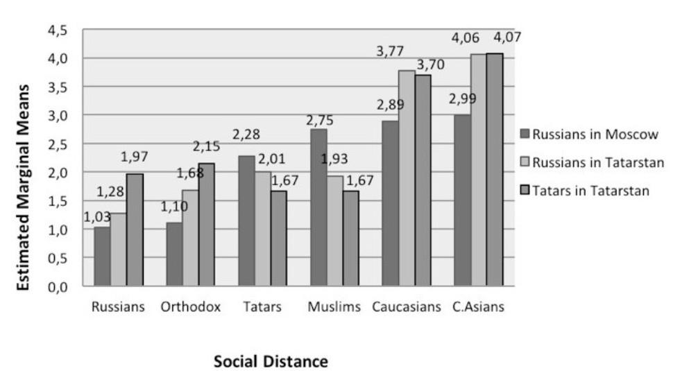 Muscovites were found to have shorter distance with Central Asian and Caucasian people, whereas in Tatarstan the teachers are more accepting of Muslims. This is attributed to the quantity of cultural contacts with respective groups.