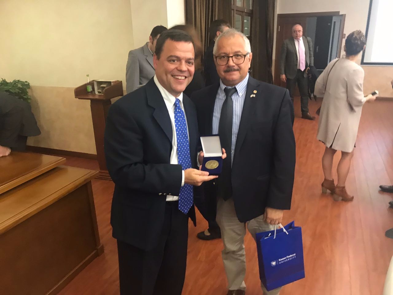 The team is headed by Assemblyman Luis R. Sepulveda and comprises his colleagues Amy Paulin, Pamela Harris, Michael Fitzpatrick, William Barclay, and others. Before arriving to the University they met with President of Tatarstan Rustam Minnikhanov, Chairman of the State Council of Tatarstan Farid Mukhametshin, and Mayor of Kazan Ilsur Metshin. Tatarstani officials and academics joined the meeting at KFU, among them Deputy of the State Council Marat Galeev, Deputy Minister of Industry and Trade Denis Valeev, Deputy Minister of the Economy Bulat Khaziakhmetov, Chairman of the Tatarstan Committee on Tourism Sergey Ivanov, Human Rights Commissioner of Tatarstan Sariya Saburskaya, Business Rights Commissioner of Tatarstan Timur Nagumanov, and representatives of leading Tatarstani universities. The discussion was moderated by Vice-Rector Linar Latypov.