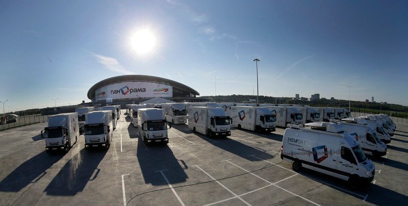 A lot of super modern broadcasting cars arrived in Kazan; they were allocated among 12 venues. Media office system allows recording and processing up to 64 signals from various sources and making immediate selection of necessary materials from video content of more than 900 hours for streaming.