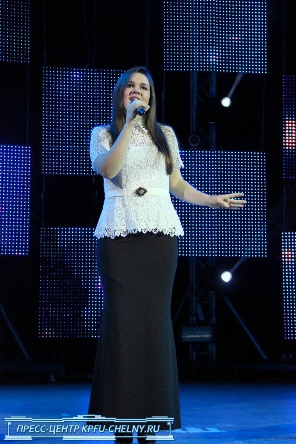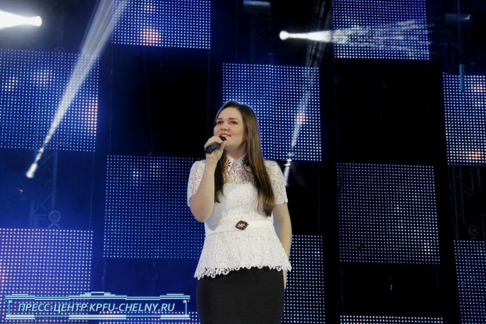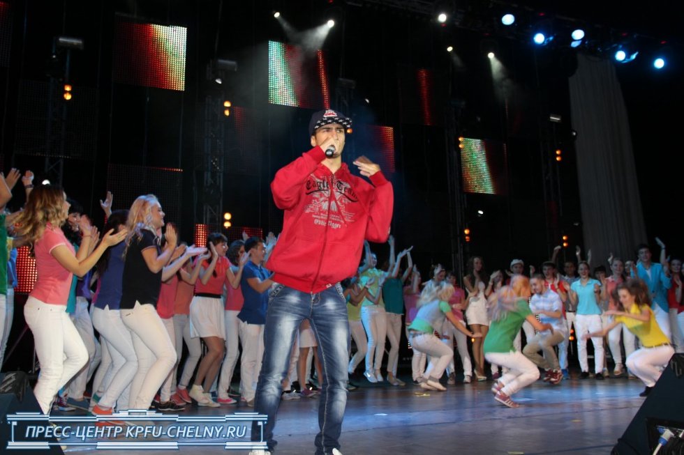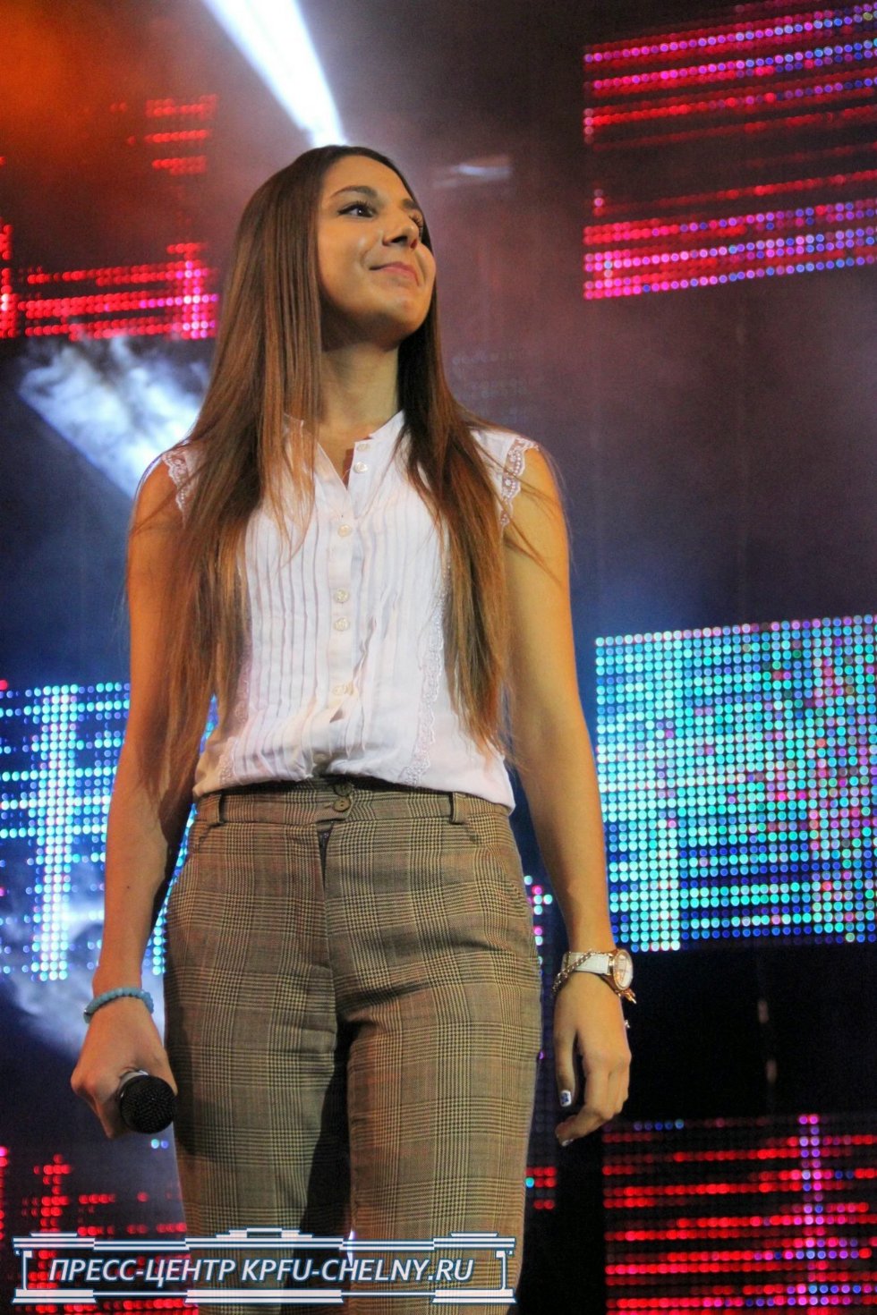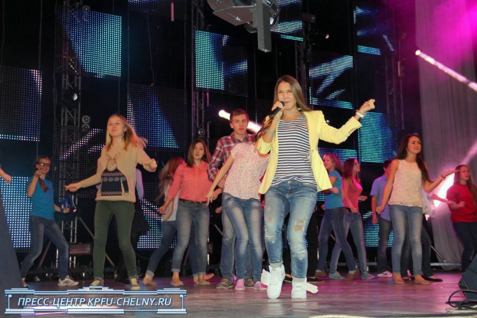 Поздравить первокурсников вышла на сцену и студентка КФУ, победительница проекта «Голос», участница международного конкурса «Евровидение» Дина Гарипова. Её песне «What if» подпевает весь зал и каждый стремиться запечатлеть ее выступление на свой мобильный телефон.