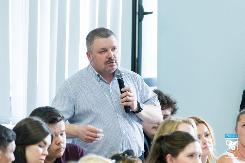 В Инжиниринговом центре КФУ прошла встреча с российским писателем, автором пьес, радио- и телеведущим, журналистом и театральным режиссёром Андреем Максимовым, в которой приняли участие студенты, преподаватели НЧИ КФУ, журналисты и все желающие.