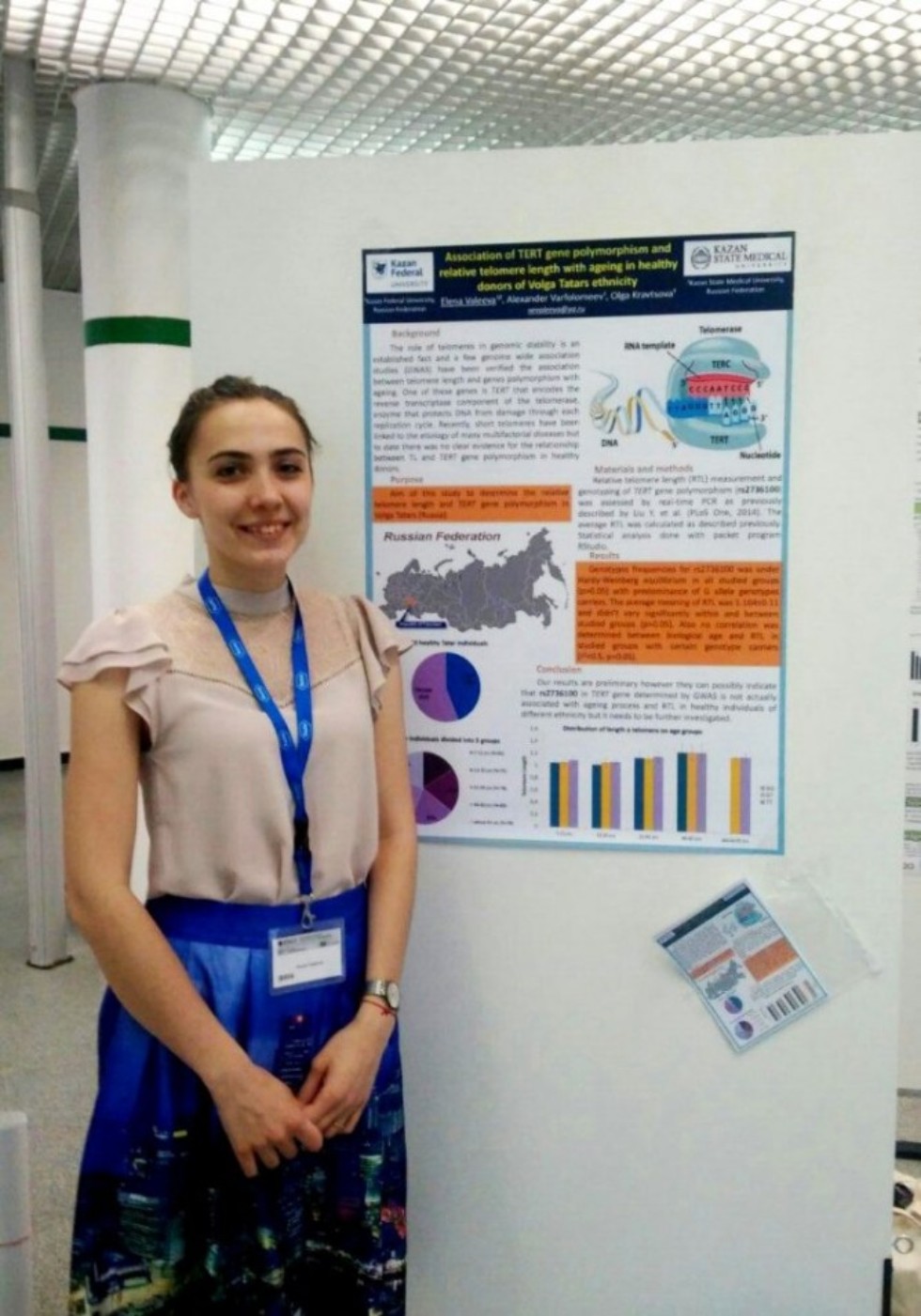 «Мое исследование посвящено выяснению корреляции между относительной длиной теломер и полиморфизмом гена TERTу волжских татар, — рассказывает Елена Валеева о своем исследовании. — Нами было показано, что полиморфизм rs2736100 гена TERT на самом деле не ассоциирован с процессом старения и длиной теломер у здоровых лиц различной этнической принадлежности. Несмотря на то, что наше исследований носит предварительный характер, оно получило высокую оценку и вызвало интерес у экспертов».