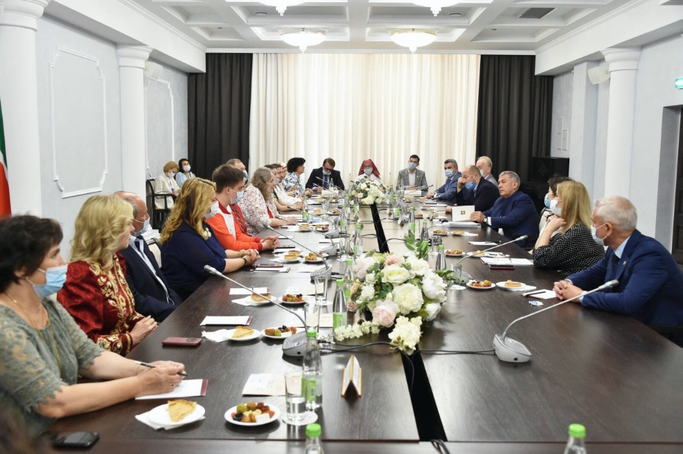 Во встрече приняли участие руководитель Аппарата Президента РТ Асгат Сафаров, заместитель руководителя Аппарата Президента РТ – руководитель Департамента Президента РТ по вопросам внутренней политики Александр Терентьев, министр образования и науки РТ Ильсур Хадиуллин, министр культуры РТ Ирада Аюпова, первый заместитель главы муниципального образования Казани Денис Калинкин, председатель правления РОО «Русское национально-культурное объединение Республики Татарстан» Ирина Александровская и представители творческой интеллигенции.