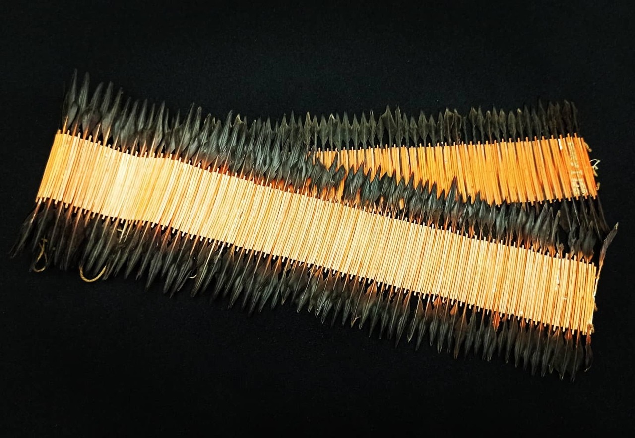 К волосам и головному убору из перьев птиц такую ленту прикалывали костяными и деревянными шпильками.