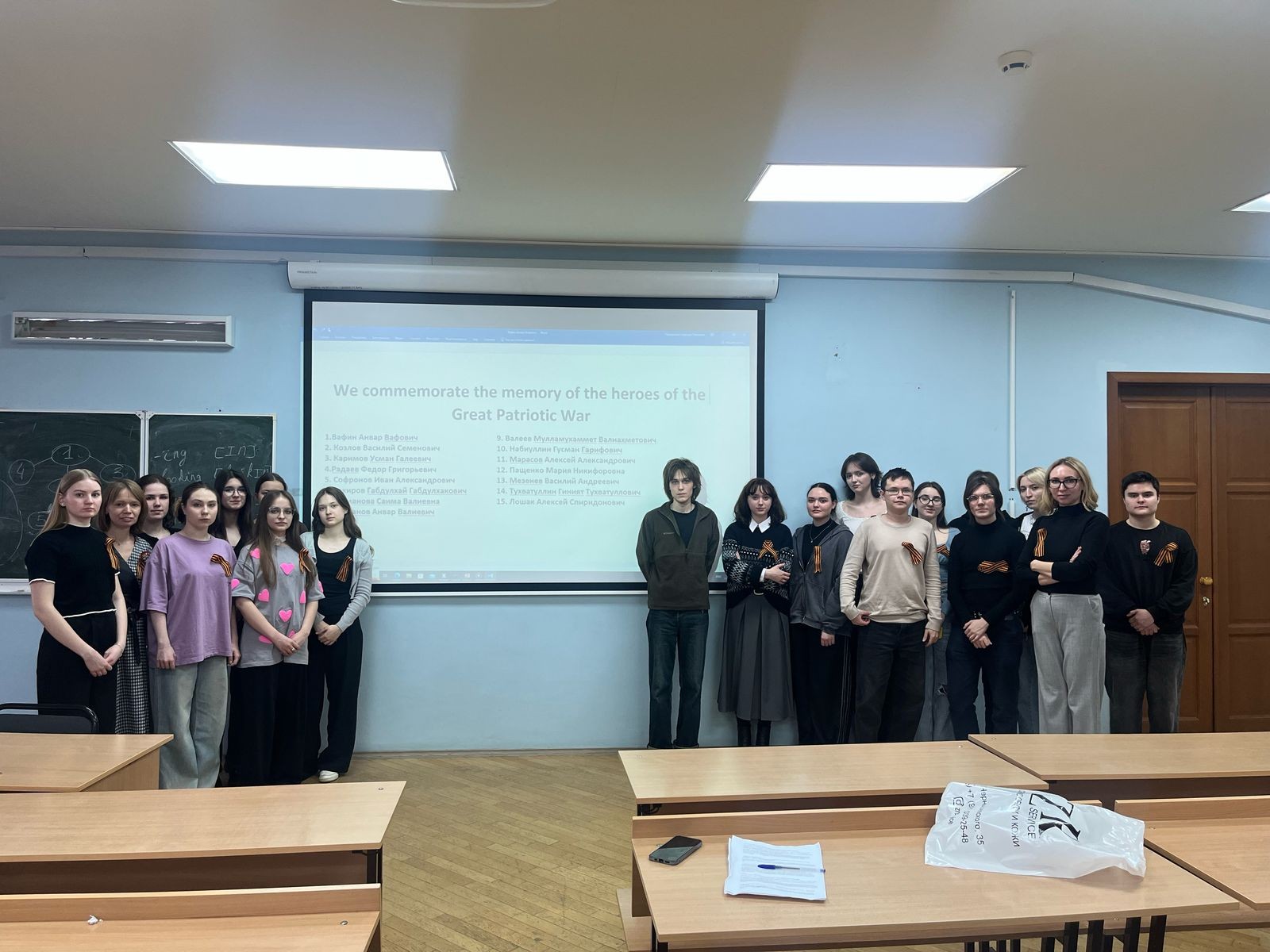 11 апреля студенты группы 04.3.404 и 04.3-309 на занятии по практическому курсу английского языка почтили память своих прадедушек и прабабушек, сражавшихся на передовой и в тылу во время Великой Отечественной Войны. Студенты выступили с презентацией на английском языке и рассказали о подвигах, ранениях и наградах своих предков, показали фотографии тех, кто еще жив и тех, кого давно нет с нами. Развитие патриотического и духовно-нравственного воспитания молодежи является важнейшей социальной потребностью общества. Научить подрастающее поколение уважать, помнить и чтить традиции, историю, любить родной край, город, народ, который в нем живёт, значит укрепить основы государственности. В конце занятия преподаватели и студенты во время минуты молчания вспомнили истории о героизме, любви и сострадании, которые навсегда останутся в нашей памяти.