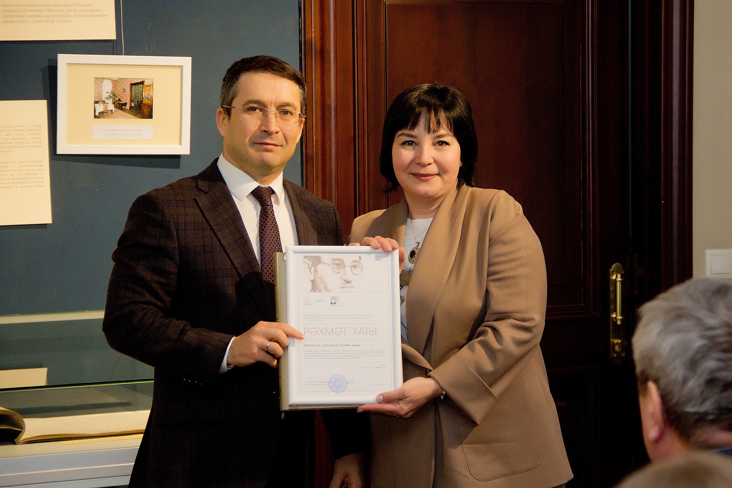 Стоит отметить, что с самых перовых дней учреждения премии сотрудники Института международных отношений, истории и востоковедения КФУ входили в состав почетного жюри в области оценки художественных переводов. В этом году члены жюри проверяли переводы рассказа Ш.Камала “Әүвәл-әүвәл заманда” («Давным-давно») на английский, турецкий и арабский языки. По результатам работы заместитель директора по международной деятельности ИМОИиВ Светлана Салаватовна Тахтарова и декан Высшей школы востоковедения – Восточный разряд Хабибуллина Эльмира Камилевна были удостоены писем благодарности за подписью Министра культуры Республики Татарстан И.Х.Аюповой.