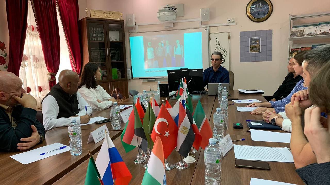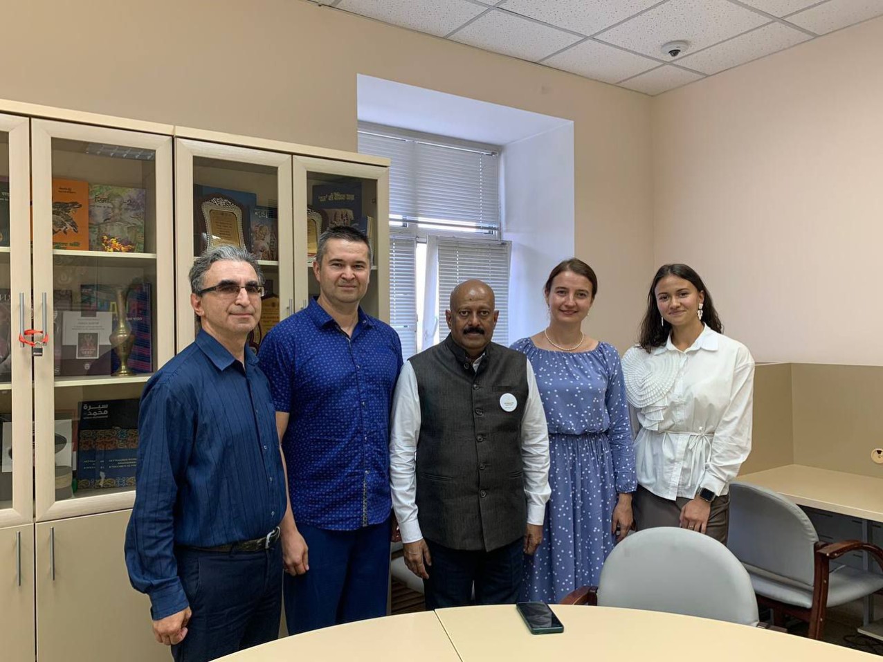 9 сентября 2024 года в нашем университете Центром Русского географического общества в Индии был организован круглый стол на тему «Язык общения Афанасия Никитина с населением и правителями во время своего путешествия». Данный Центр открылся в 2023 году на базе Российского центра науки и культуры в Тривандруме – столице штата Керала. Проект «VOYAGE@555» охватил семь городов России, упомянутых Афанасием Никитиным в книге «Хождение за три моря» – это Тверь, Ярославль, Кострома, Нижний Новгород, Астрахань, Дербент и Казань. В рамках проекта в Казань прибыла делегация из Индии в составе двух человек – Почетный Консул Российской Федерации, Директор Русского дома в г. Тривандрум Ратиш Наир и генеральный директор Департамента иностранных дел Рави Чандран.