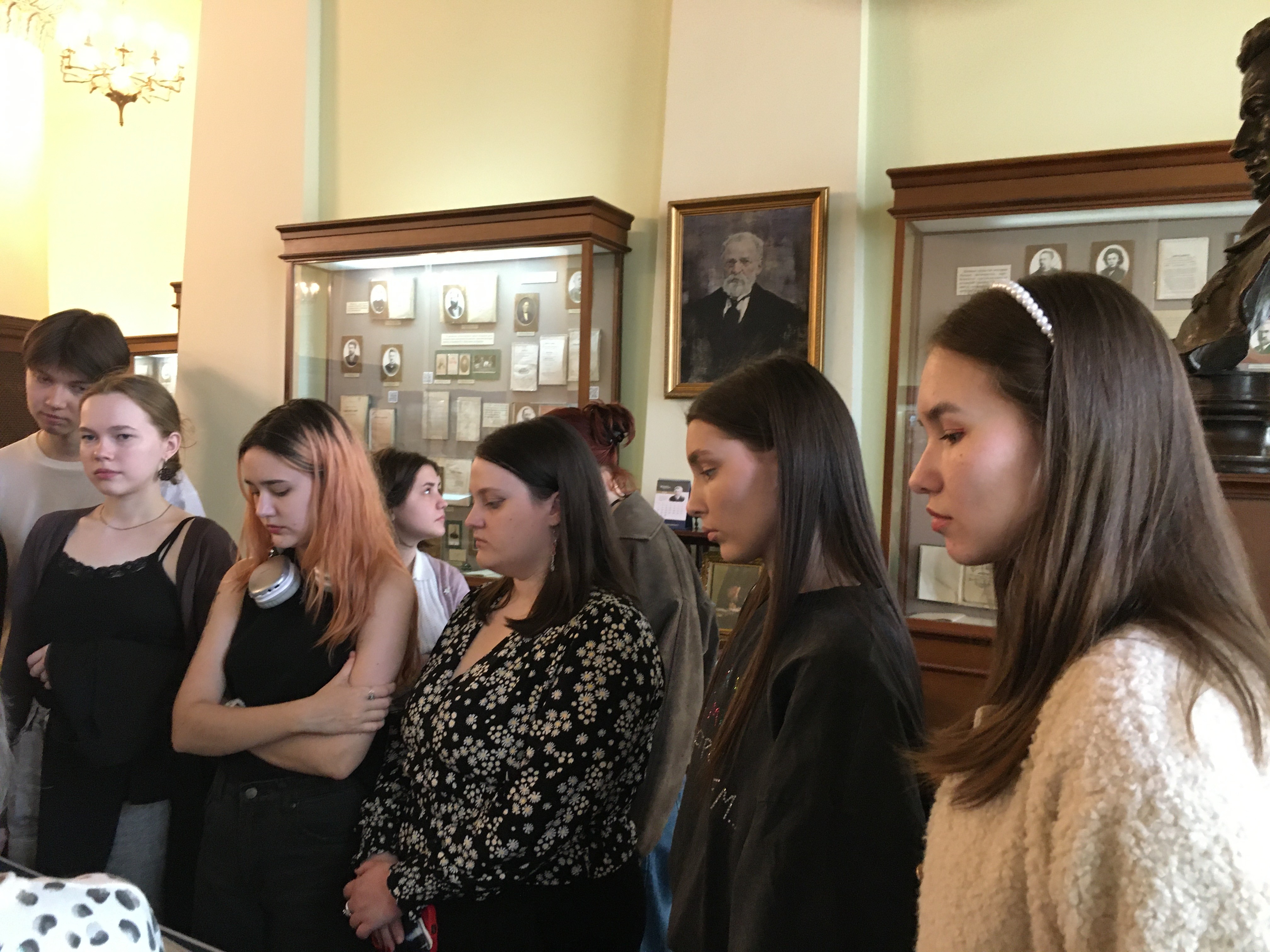 В мемориальной Ленинской аудитории они посидели за партами студентов XIX века и оценили удобство и комфортность. Экскурсовод рассказала им, что гигиенический стандарт старинной учебной мебели был высоко оценен современными медиками-ортопедами,побывавшими в этой аудитории. Студенты XXI века позавидовали студентам XIX века.За такими партами действительно можно без напряжения прослушать несколько лекций! Они сокрушались о том, что современная мебель в аудиториях совсем непохожа на парты XXI века. От долгого сидения за обычными письменными столами и плоскими партами портится осанка и зрение, возникают и другие проблемы со здоровьем. По признанию студентов, эта часть экскурсии особенно им запомнилась и вызвала много эмоций. На выходе из музея они заинтересовались экспонатами выставки новых поступлений, открывшейся буквально накануне. Время экскурсии, насыщенные новой информацией, пролетело незаметно! Впечатления от посещения лучшего вузовского музея России надолго останется в памяти студентов, и, возможно, они еще не раз захотят прийти сюда и на новые выставки, и на значимые мероприятия.