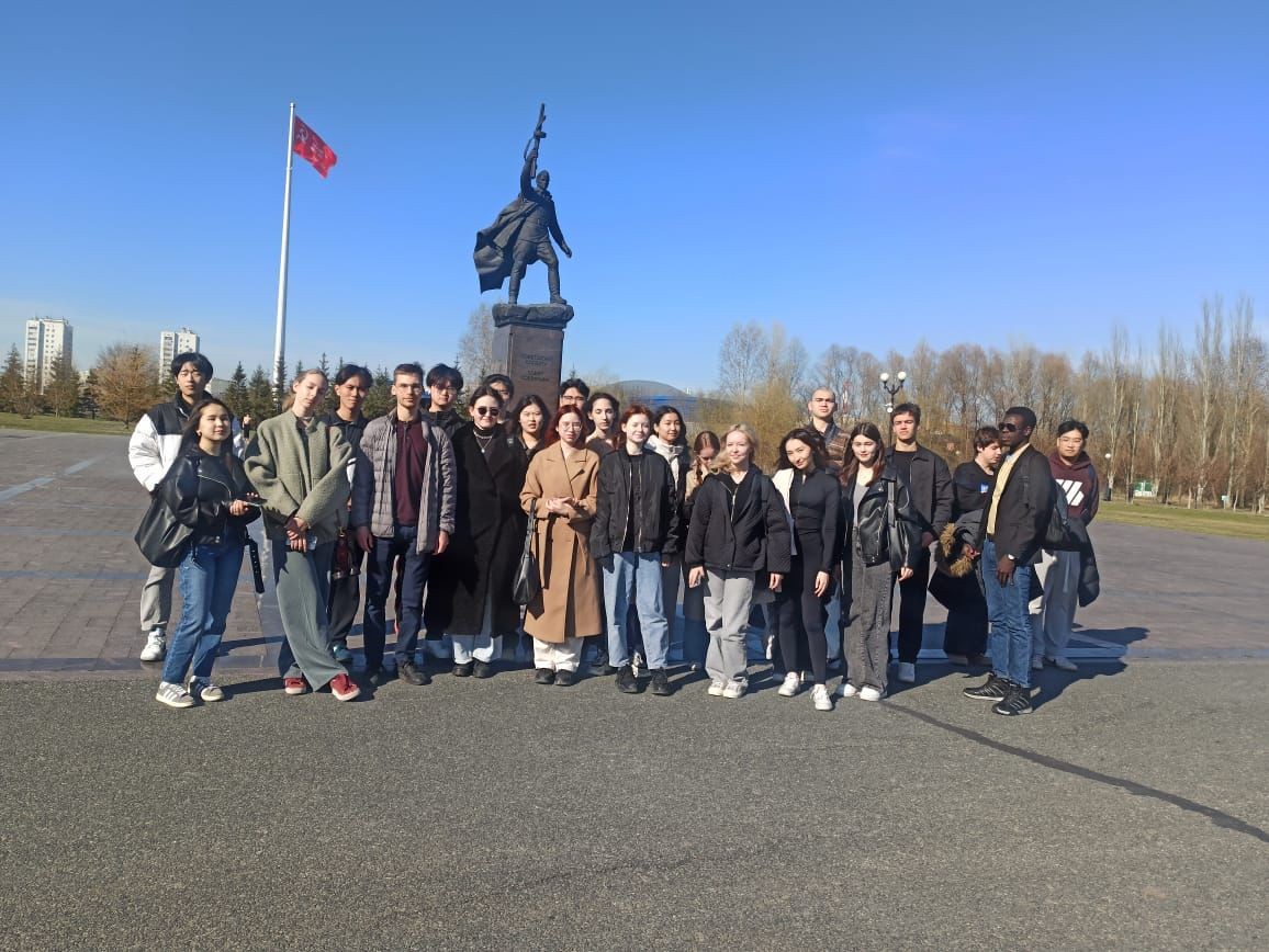 Студенты посмотрели выставку военной техники, на которой представлены образцы вооружения как середины 20-го века, так и современности - разнообразные модификации танков, артиллеристских установок, гаубиц, самолетов (в том числе известнейший МиГ-27) и даже фрагменты атомной подлодки «Казань». Посетили Мемориал Памяти Героям Великой Отечественной войны, памятник матери, скорбящей по погибшим воинам, памятник труженикам тыла, памятник Советскому солдату. Прошлись по аллеям парка, посвященным отдельным видам войск, изучили обелиски, представляющие собой дань памяти военным частям, которые были сформированы в Казани.